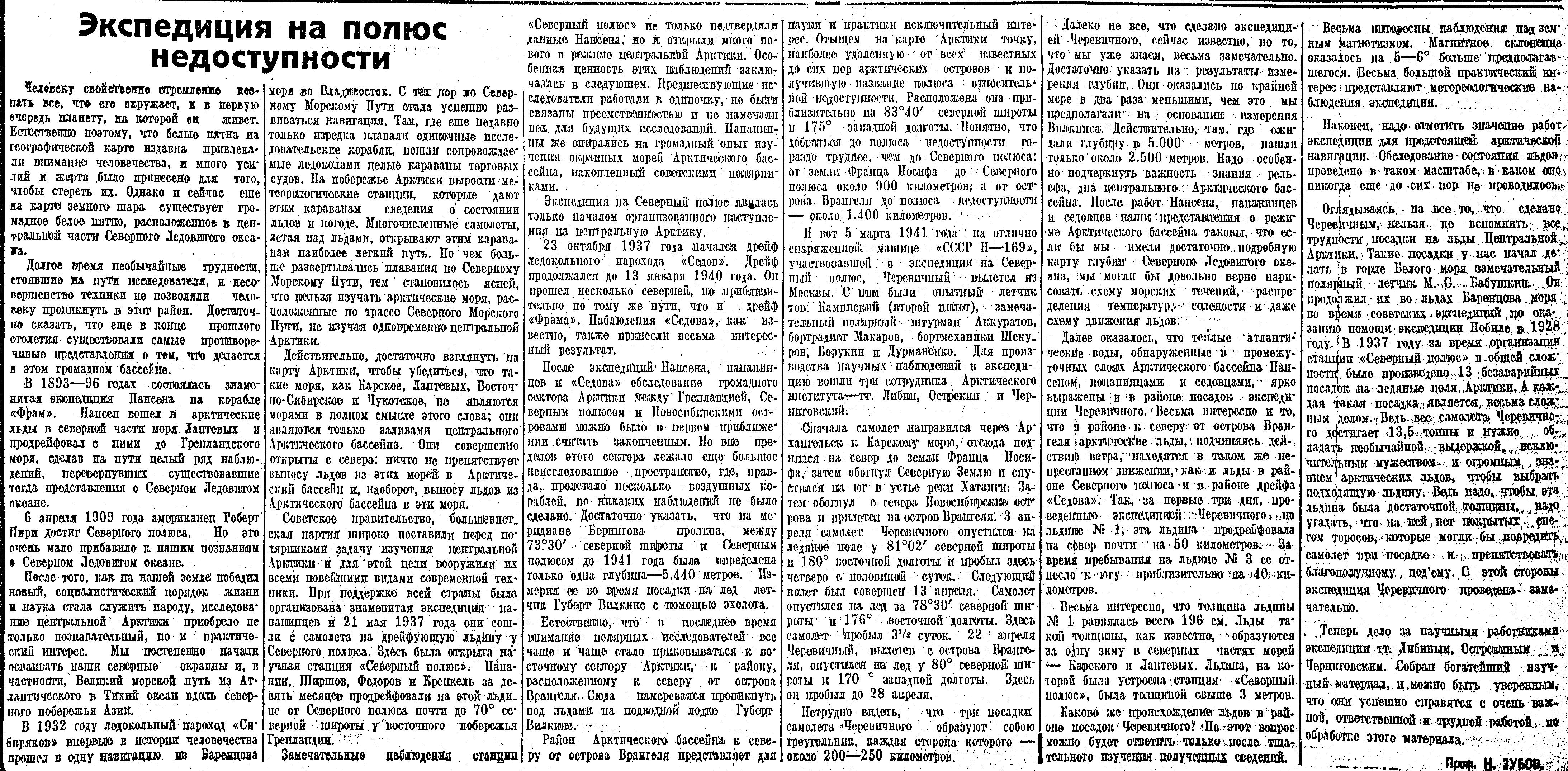 Я помню, когда в 1950 году ученики и последователи Зубова, вернувшись из очередной воздушной высокоширотной экспедиции, рассказали ему об открытии хребтов Ломоносова и Менделеева, он искренне радовался, притащил участников экспедиции в Московский университет и здесь, в актовом зале географического факультета, заставил рассказать ученым-географам о замечательных открытиях в Центральной Арктике.