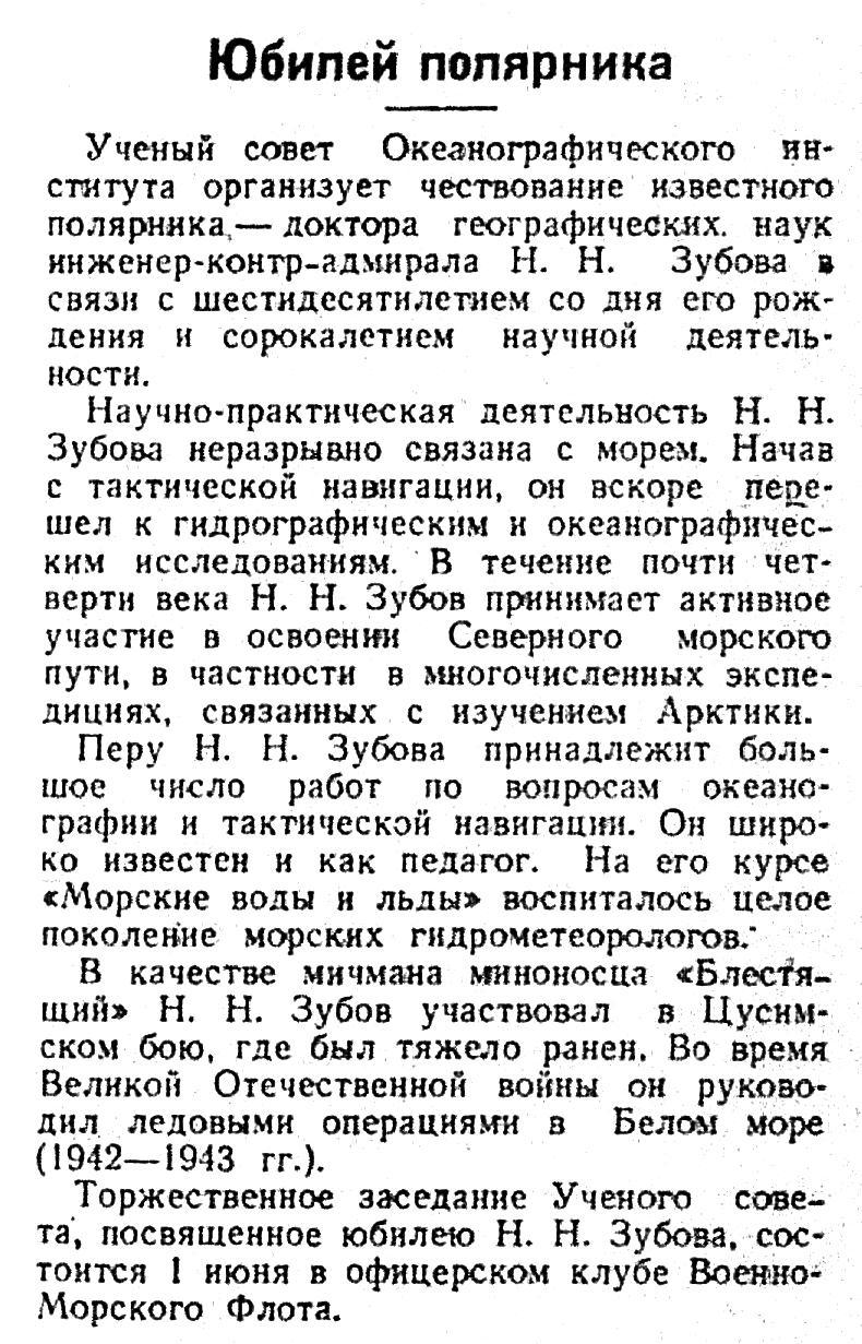 «Советское правительство предоставило все возможности для плодотворной научной деятельности Н. Н. Зубова. После службы в штабе Военно-Морских сил он откомандировывается в Народный Комиссариат просвещения для участия в организации Плавучего морского института, созданного по инициативе В. И. Ленина. В это же время Н. Н. Зубов пишет несколько статей по вопросам военно-морского искусства». Там же говорится, что в 1923-24 году Зубов читал в Военно-Морской академии специальный курс тактической навигации. Первую работу по океанологии он опубликовал в 1926 году, когда ему шел уже 41-й год. Таков путь Н. Н. Зубова к главному делу своей жизни.