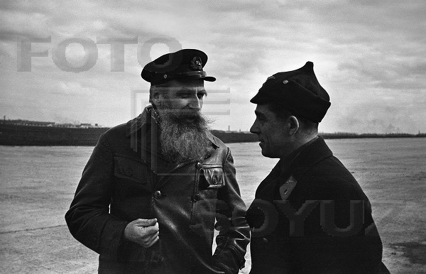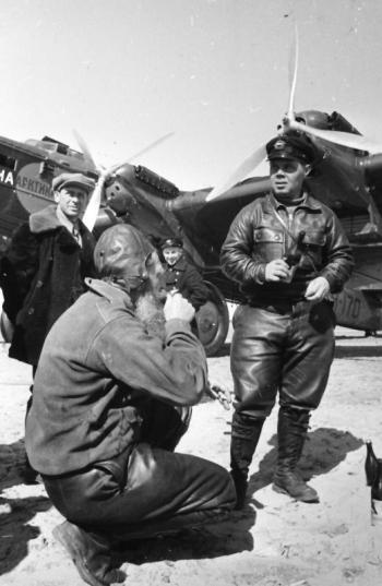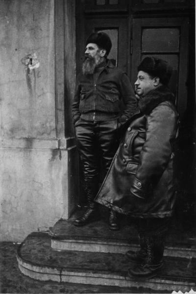 С М.В.Водопьяновым. Подпись: Два командира...перед полётом на льдину в районе Северного полюса для организации экспедиции товарища И.Д.Папанина. 22 марта 1937 г.