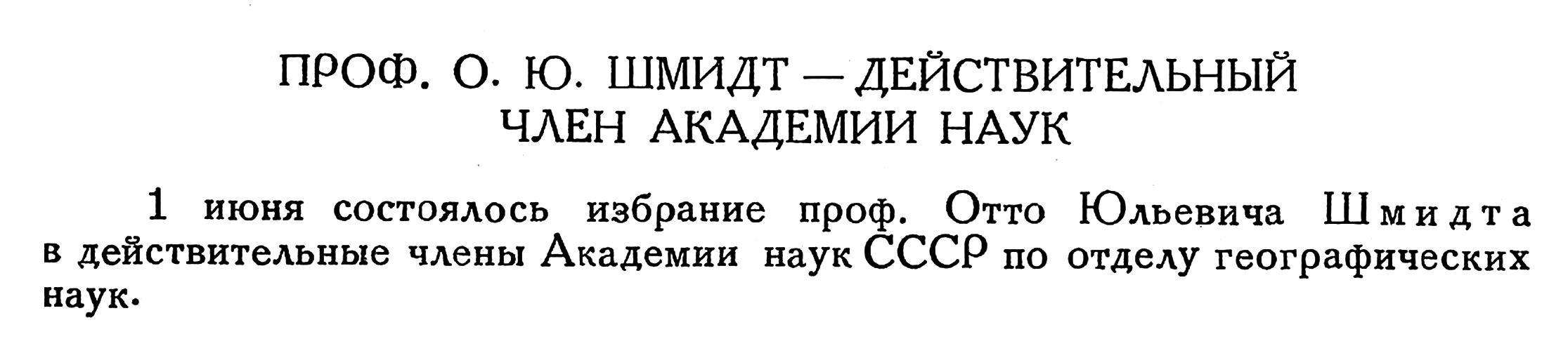 1 июня состоялось избрание проф. Отто Юльевича Шмидта в действительные члены Академии наук СССР по отделу географических наук.
