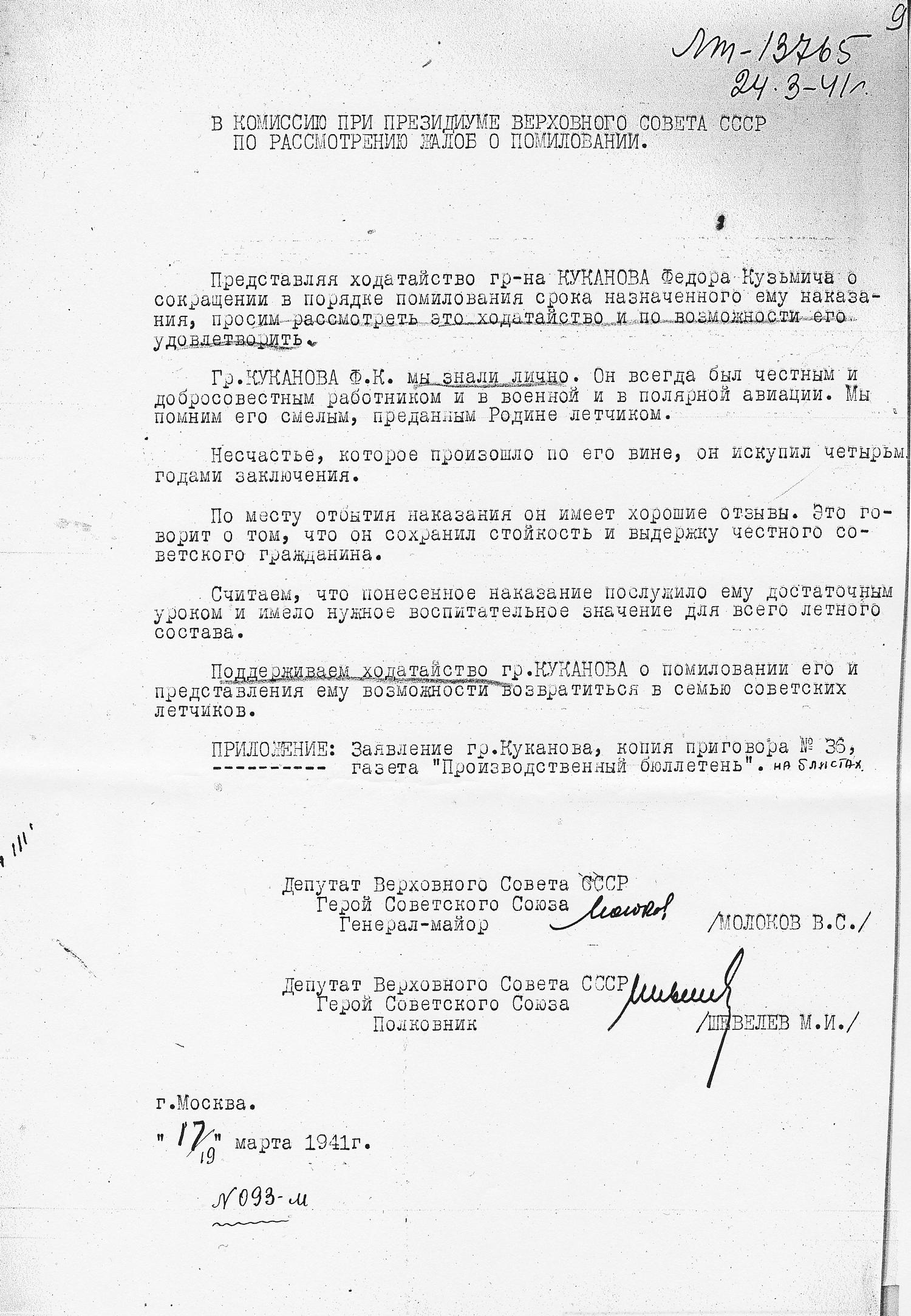 Авария явилась не результатом моего отношения к лётной работе, а результатом ошибки, вызванной переутомлением (авария произошла на 5-м часу полёта в этот день и на 4-ый день нахождения в рейсе), также как и тяжёлые последствия аварии вызваны не размерами (тяжестью) самой аварии, а отсутствием спасательных средств, т.к. авария произошла на заполярной линии, на реке Енисее, в тайге. Не умаляя своей ответственности даже при этих обстоятельствах, я прошу принять во внимание: что вся моя сознательная жизнь прошла в рядах РККФ и ВВС РККА, куда я поступил добровольно с 18-летнего возраста, т.е. с 1922 года, а затем в ВВС с 1926 по 1933 год; с 1933 по 1936 год я работал в полярной авиации Главсевморпути, где был дважды награждаем Правительством орденами Союза ССР, – за спасение челюскинцев и за работу на севере, каковые Военный Трибунал, при вынесении приговора, нашёл возможным сохранить за мной;