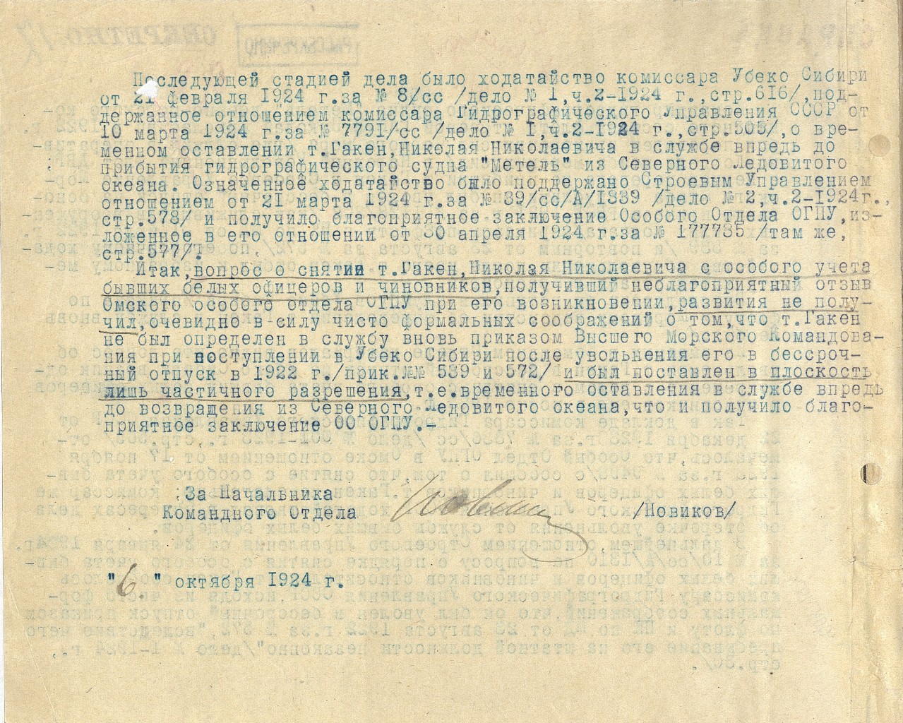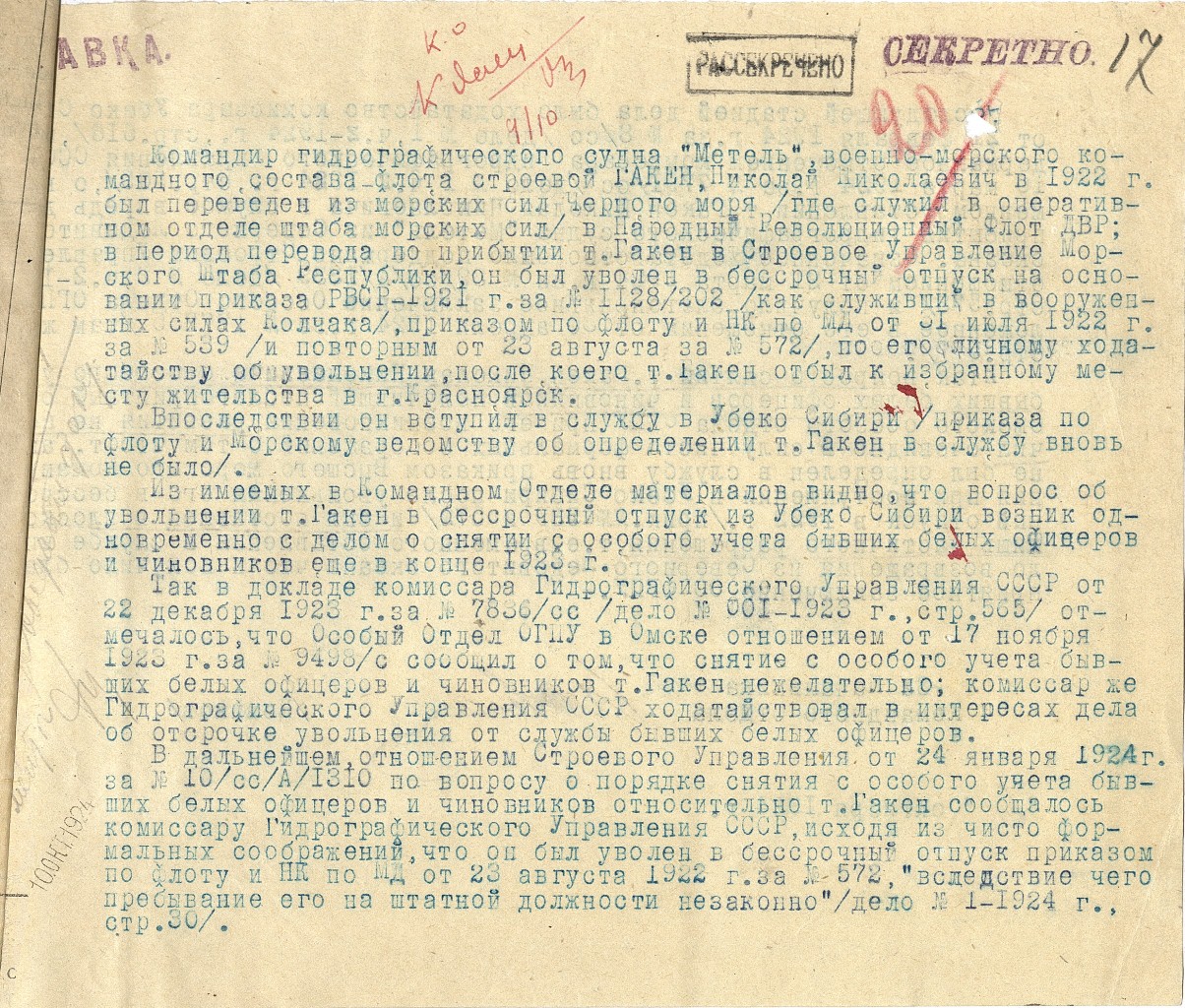28.07.1922 На основании приказа РВС №1128/202 и по флоту №110/с и 64/с уволен в бессрочный отпуск с направлением для зачисления на учет в Красноярский ГВК.