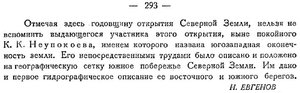 Отмечая здесь годовщину открытия Северной Земли, нельзя не вспомнить выдающегося участника этого открытия, ныне покойного К. К. Неупокоева, именем которого названа югозападная оконечность земли. Его непосредственными трудами было описано и положено на географическую сетку южное побережье Северной Земли. Им дано и первое гидрографическое описание ее восточного и южного берегов.