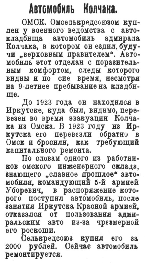 Обнаружил авто Колчака среди трофеев начальник автомобильного управления 5-й армии Борис Васильевич Воскресенский. Свою находку он оформил рапортом командарму. Для охраны ценного экземпляра был выставлен караул из красноармейцев Ильиных и Мельника.