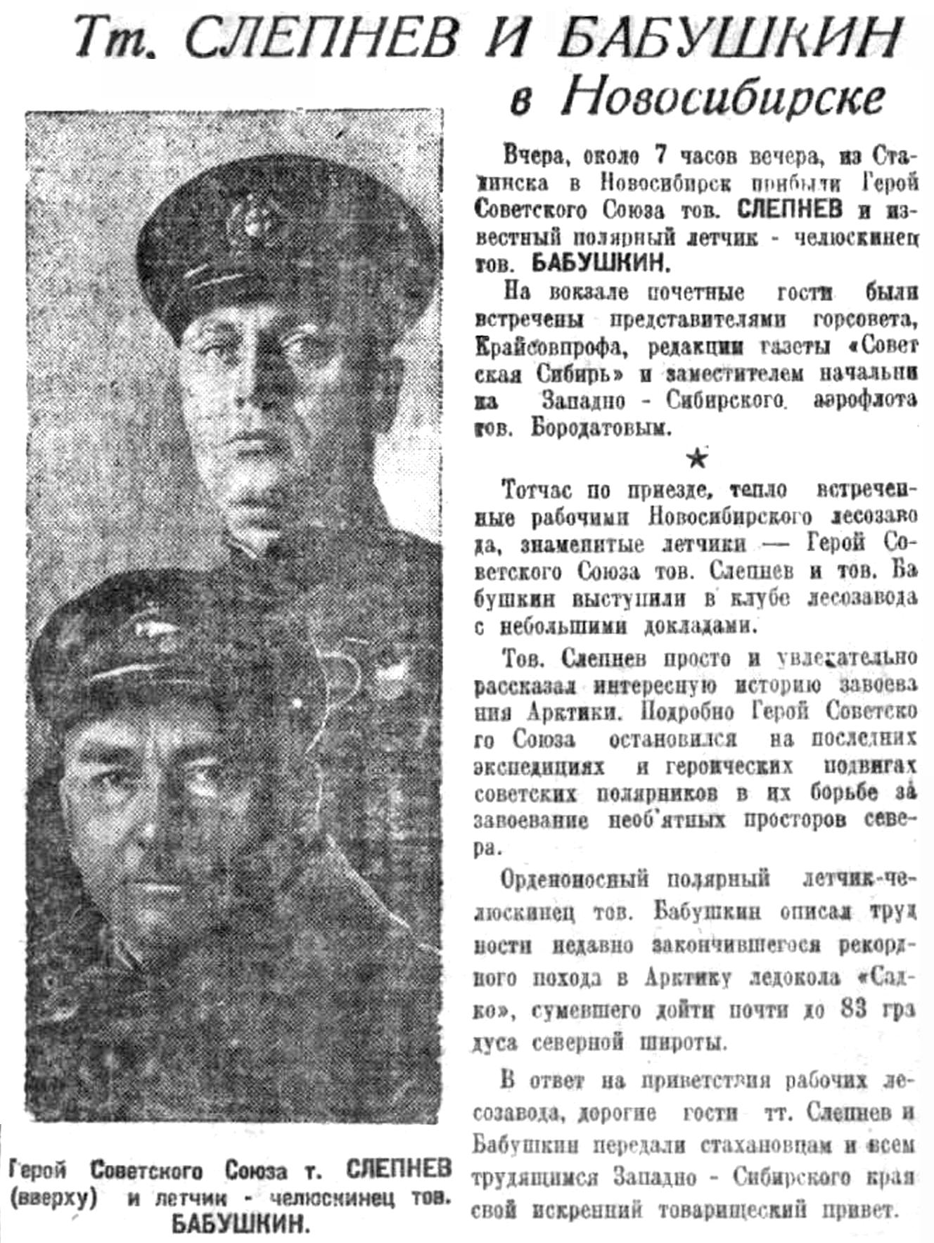 Вчера, около 7 часов вечера, из Сталинска в Новосибирск прибыли Герой Советского Союза тов. СЛЕПНЕВ и известный полярный летчик - челюскинец тов. БАБУШКИН.