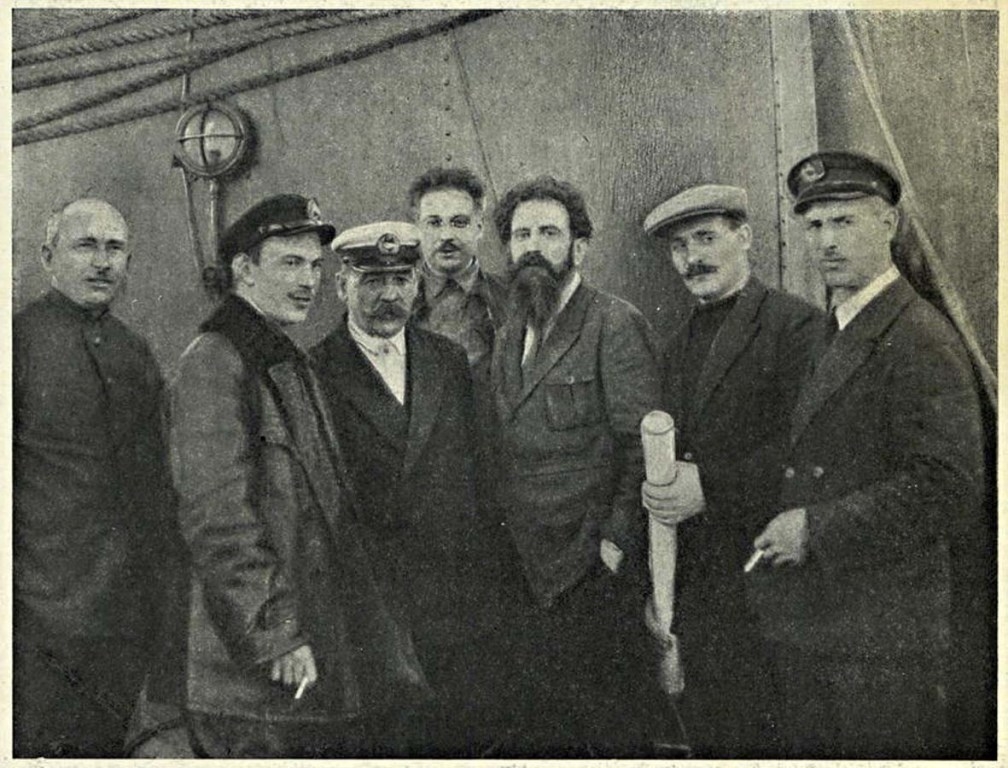 "Челюскин" прибыл 2 августа, где гриступил к дополнительной погрузке. Слева направо: