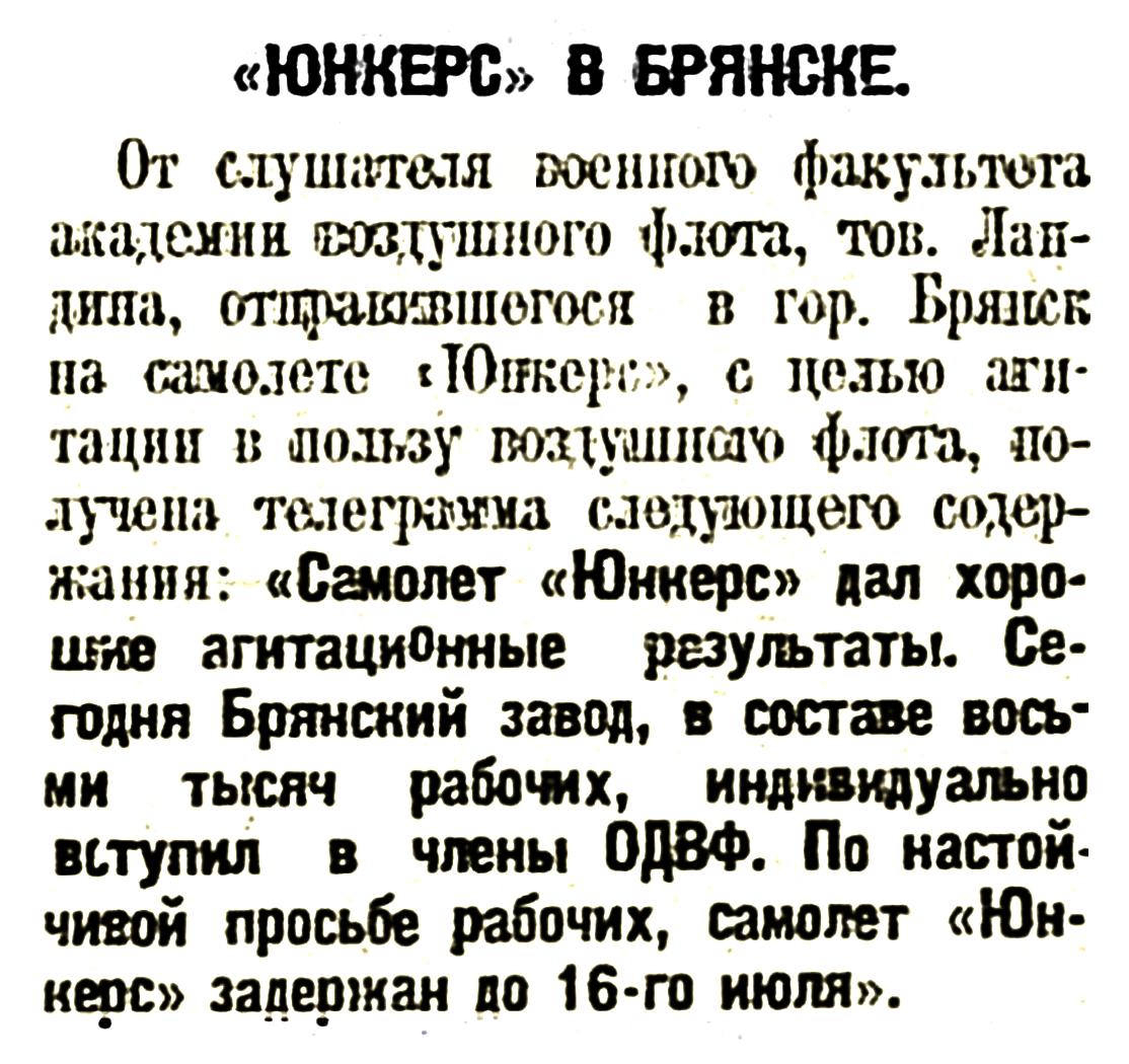 От слушателя военного факультета академии воздушного флота им. проф. П. Е. Жуковского тов. Ландина, отправившегося в гор. Брянск на самолете «Юнкерс» с целью агитации в пользу воздушного флота, получена телеграмма следующего содержания: «Сегодня на Брянском заводе все восемь тысяч работах индивидуально вступили в члены ОДВФ.