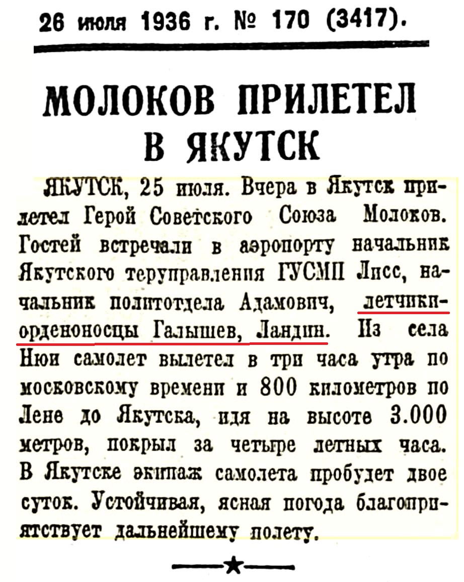 Интересно какие задачи выполнял Ландин в 1936 году в Якутске? Помощь перелету Молокова? Или чувствовал, что кранты вскоре? И уехал подальше от столиц...