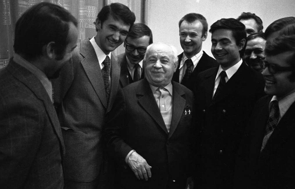 На приёме в Кремле 17 марта 1938 г. На фото И.В. Сталин, Папанинцы (И.Д. Папанин, П.П. Ширшов, Е.К. Федоров, Э.Т. Кренкель), члены их семей, лётчик, Герой Советского Союза М.В. Водопьянов, выдающийся советский актёр, Народный артист СССР И.М. Москвин. Фото: ИТАР-ТАСС, газета «Правда» 1937-1938 гг., РГО