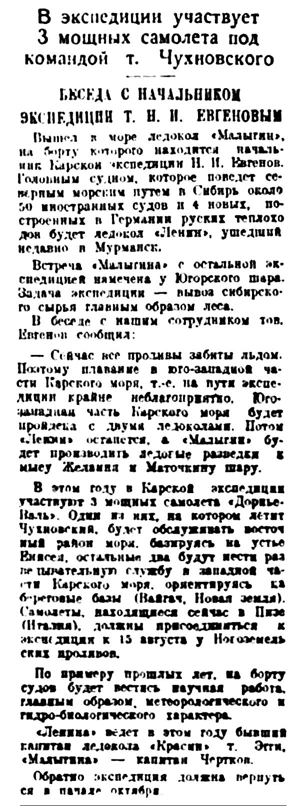 Правда Севера, 1930, №168, 21 июляВ КАРСКУЮ ЭКСПЕДИЦИЮ ИДЕТ К СИБИРСКИМ РЕКАМ ПЯТЬДЕСЯТ "ИНОСТРАНЦЕВ"