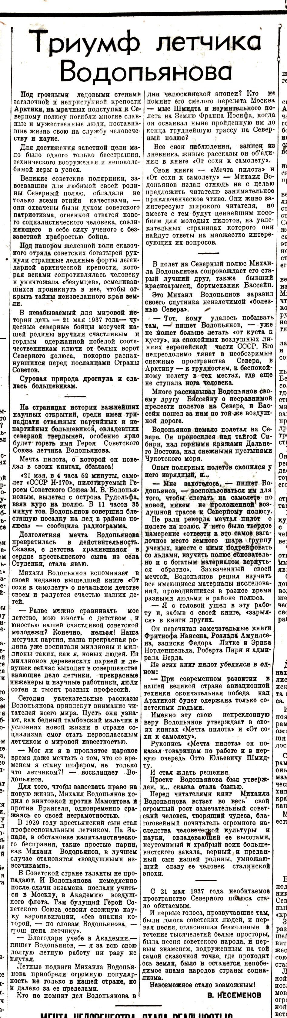 Несеменов В.Триумф летчика Водольянова//Литературная газета,1937,№ 28 (664),26 мая