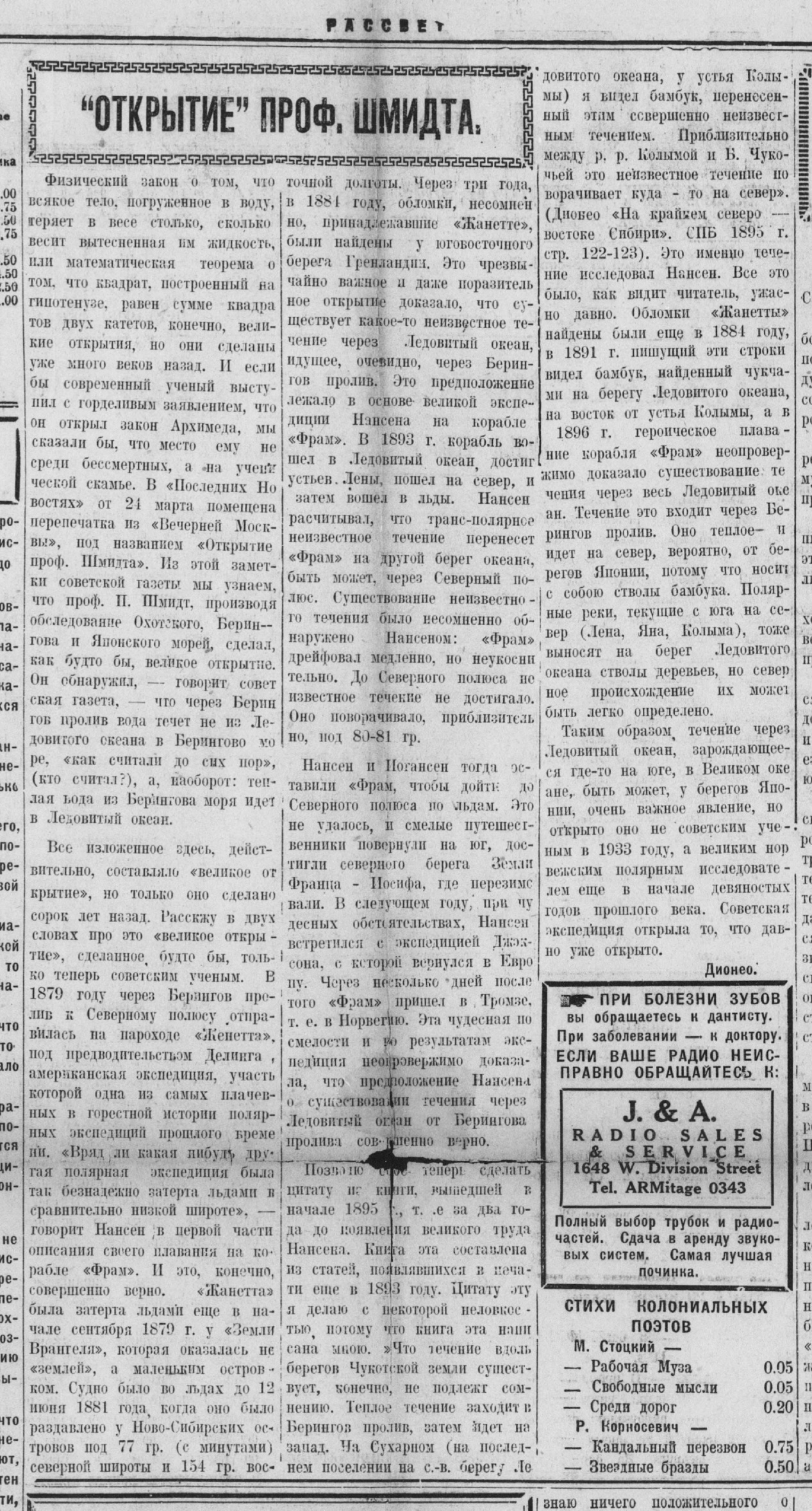 "Открытие" проф.Шмидта//Рассвет,19 апреля 1933 г.