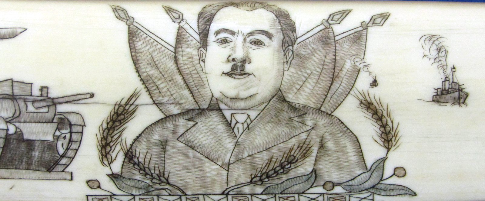 Еще один бивень конца 30-х с гравированным портретом И.Д. в окружении танков и боевых кораблей. Возможно, наивный туземный художник перепутал Папанина с Ворошиловым.