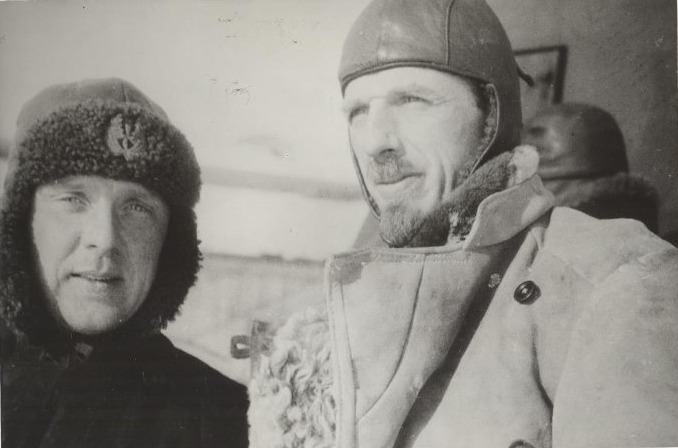 Ф.Б.Фарих (справа) с бортмехаником Ф.И.Бассейном - участники экспедиции по спасению "челюскинцев». 1934 г. Фото В.В.Микоши.