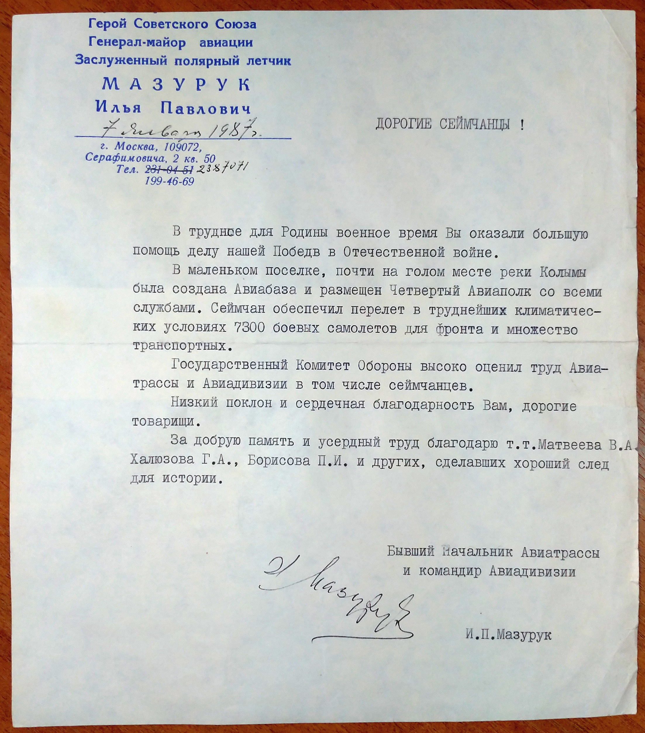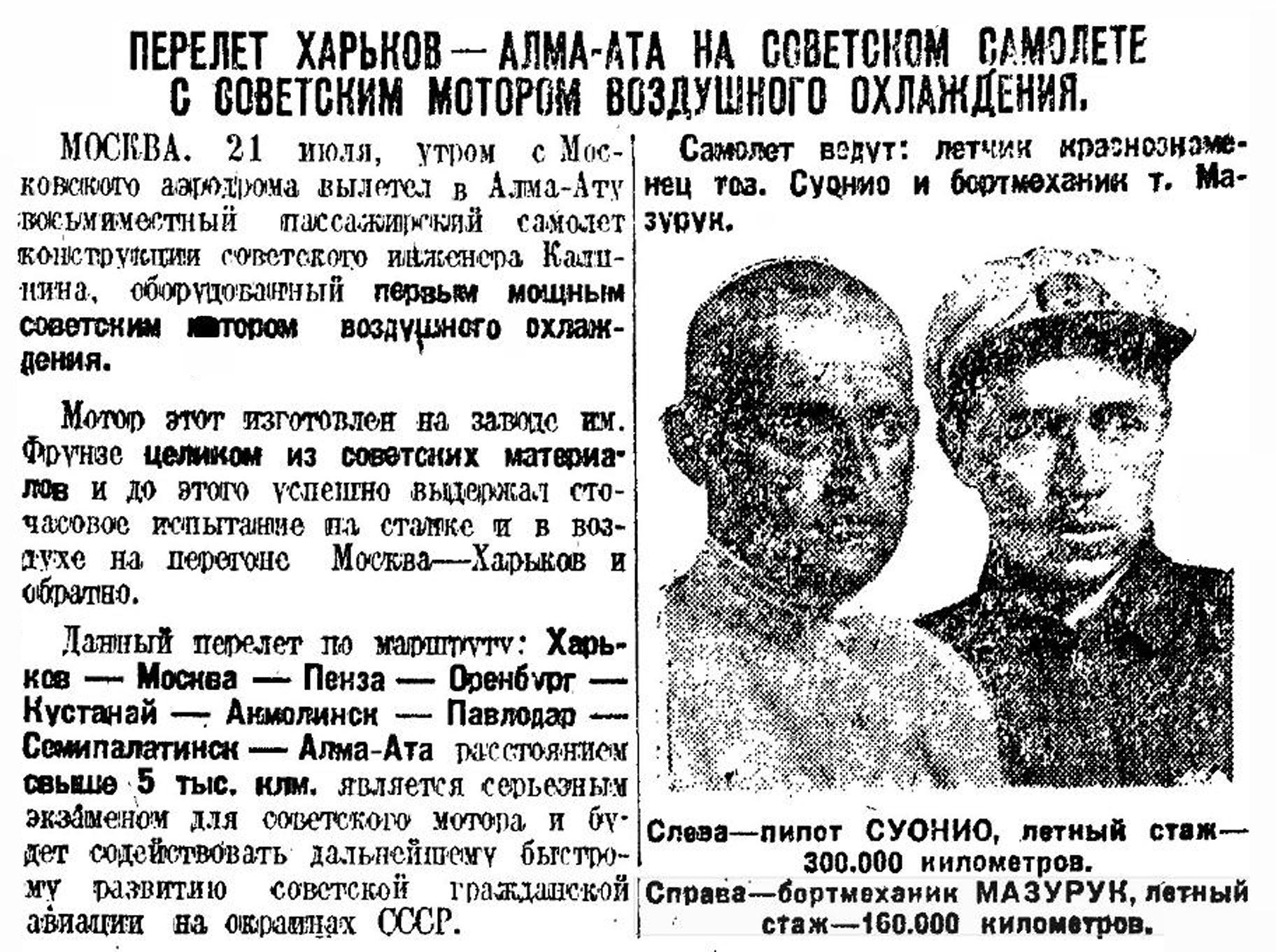 Мазурук. Над Арктикой и Антарктикой пишет:В 1931 году был организован дальний перелет, в котором участвовал в качестве бортмеханика. Пять тысяч километров: Харьков — Москва — Пенза — Оренбург — Кустанай — Акмолинск — Павлодар—Семипалатинск — Алма-Ата. По тем временам перелет очень примечательный: на советском самолете, с первым советским мотором воздушного охлаждения. Газета “Правда” с гордостью писала тогда: “Мотор этот изготовлен на заводе имени Фрунзе целиком из советских материалов”. Понятно, что на летчика Теодора Вильгельмовича Суонио и на меня как на бортмеханика возлагалась большая ответственность.