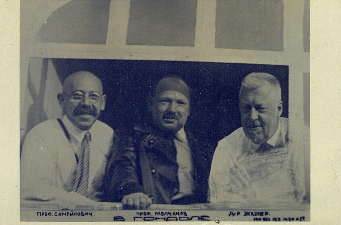 Проф. Самойлович, проф. Молчанов, д-р Эккенер в гондоле: [открытка]. - Ленинград: Лен. обл. ОСО ШВФ: [1931?]. - Фото; 8,7 х 13,8 см.