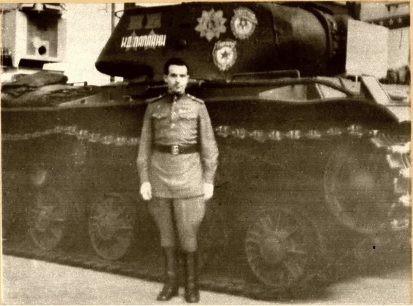 Снимок из публикации полковника-инженера в отставке Виталия Ивановича Горячева (1909 г. рожд.), бывшего зам. нач. АБТУ 65 А по ремонту и снабжению, который сфотографировался на память возле прославленной машины. В.И.Горячев с 1942 г. всё время воевал в составе 65-й армии генерала Павла Ивановича Батова.