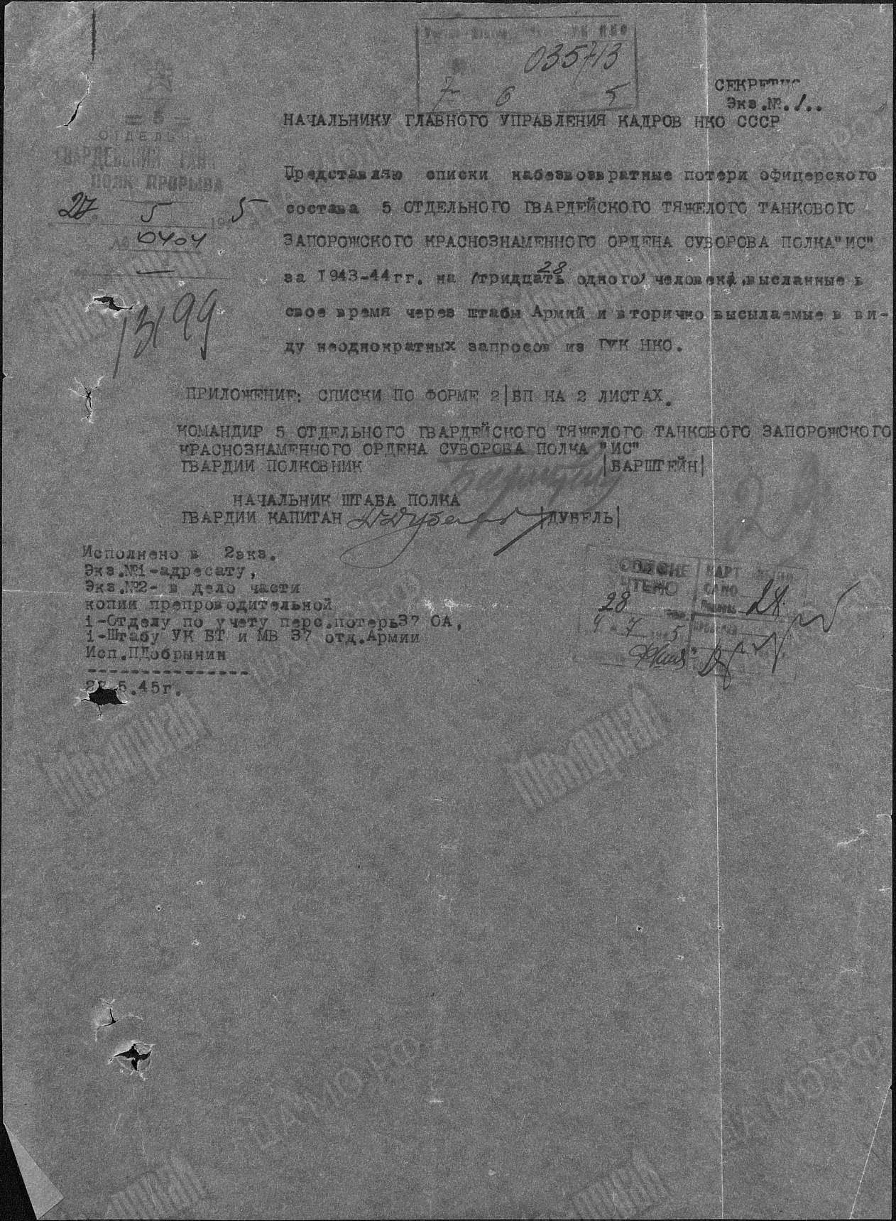 http://goskatalog.ru/portal/#/collections?id=10379049Дело в том, что с 13 февраля 1944 г. и 29-й гв. отпп и 5-й гв. отпп были переведены на новый штат № 010/460. Они получили новые танки из Челябинска (ЧТЗ – «танкограда») ИС-2 («Иосиф Сталин», по документам КВ-122 или ИС-122). Полки имели по 4 роты по 5 танков и 1 танк в управлении полка, роту автоматчиков, роту технического обеспечения, взвод управления, сапёрный взвод, хозвзвод и полковой медицинский пункт, а также 3 английских БТР Универсал и 1 БА-64. Всего по 21 танку и по 374 чел личного состава. Они стали называться отдельными гвардейским тяжёлыми танковыми полками.