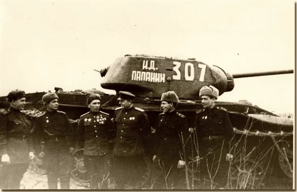 На снимке у танка «И.Д.Папанин» - третий слева - командующий 65-й А Герой Советского Союза П.И.Батов. Машина имеет новый тактический номер 307. Исходя из изложенного, следует вывод, что Павел Иванович Батов сохранил у себя в армии память о танковой колонне «Советский полярник» и непосредственно именной танк «И.Д.Папанин», с которыми сражался в Сталинградской битве. Но… в других танковых полках, эксплуатировавших танки КВ.