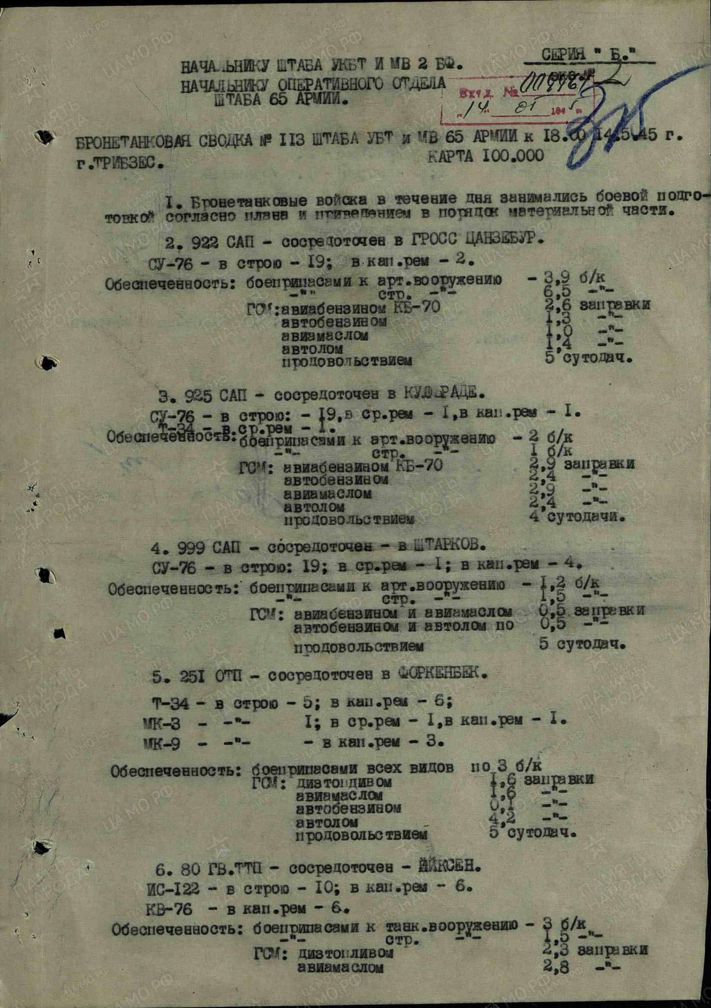 Что же относительно 65-й А П.И.Батова, воевашей в состава 1-го и 2-го Белорусских фронтов, то она участвовала в битве за Берлин и дошла с боями в Германии до земли Мекленбург–Передняя Померания.