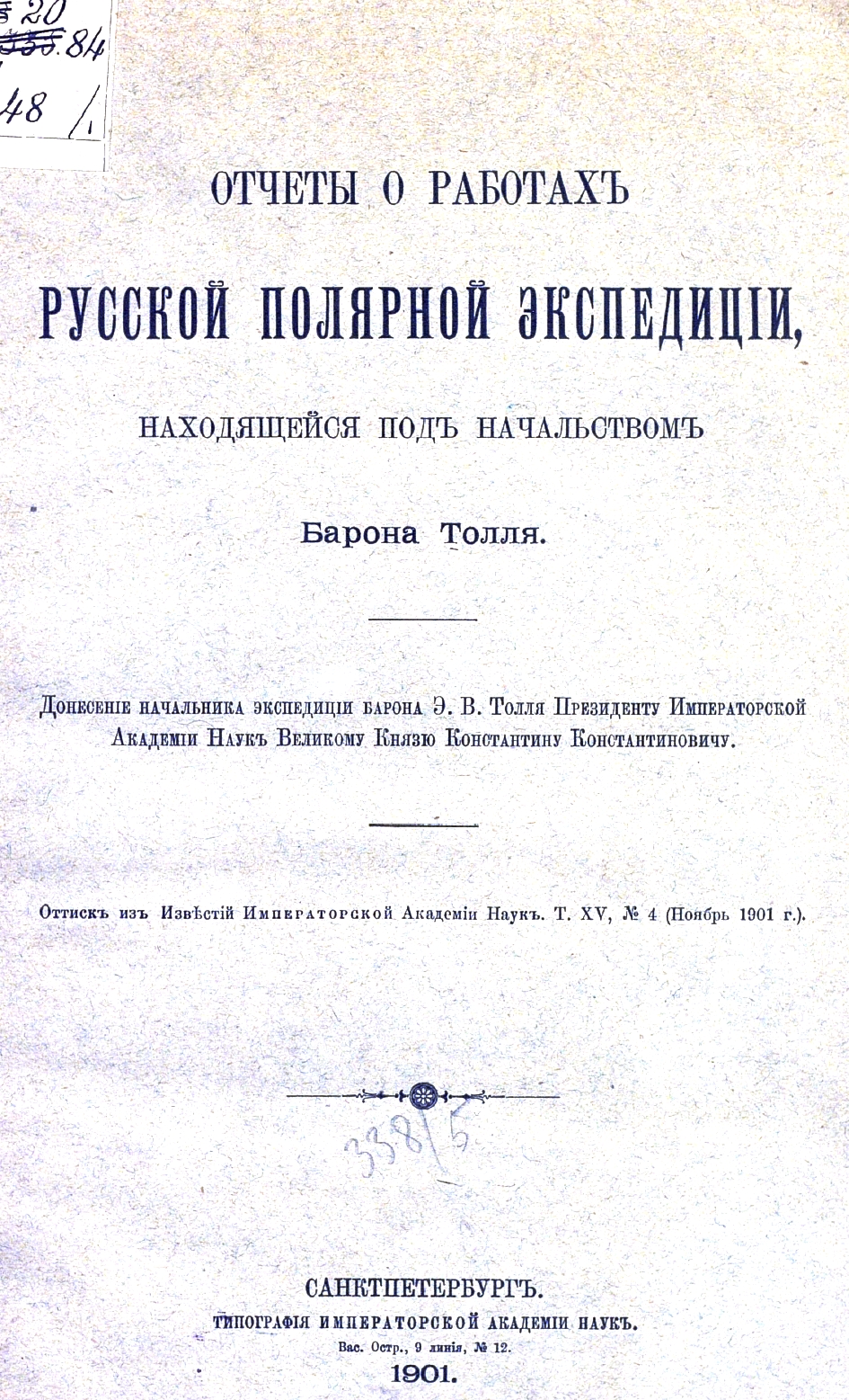 Толль Э.В,. "Отчеты о работах Русской полярной экспедиции, находящейся под начальством барона Толля. Донесение начальника Экспедиции барона Э.В. Толля Президенту Императорской Академии наук Великому Князю Константину Константиновичу" - Санкт-Петербург: типография Императорской академии наук: 1901.