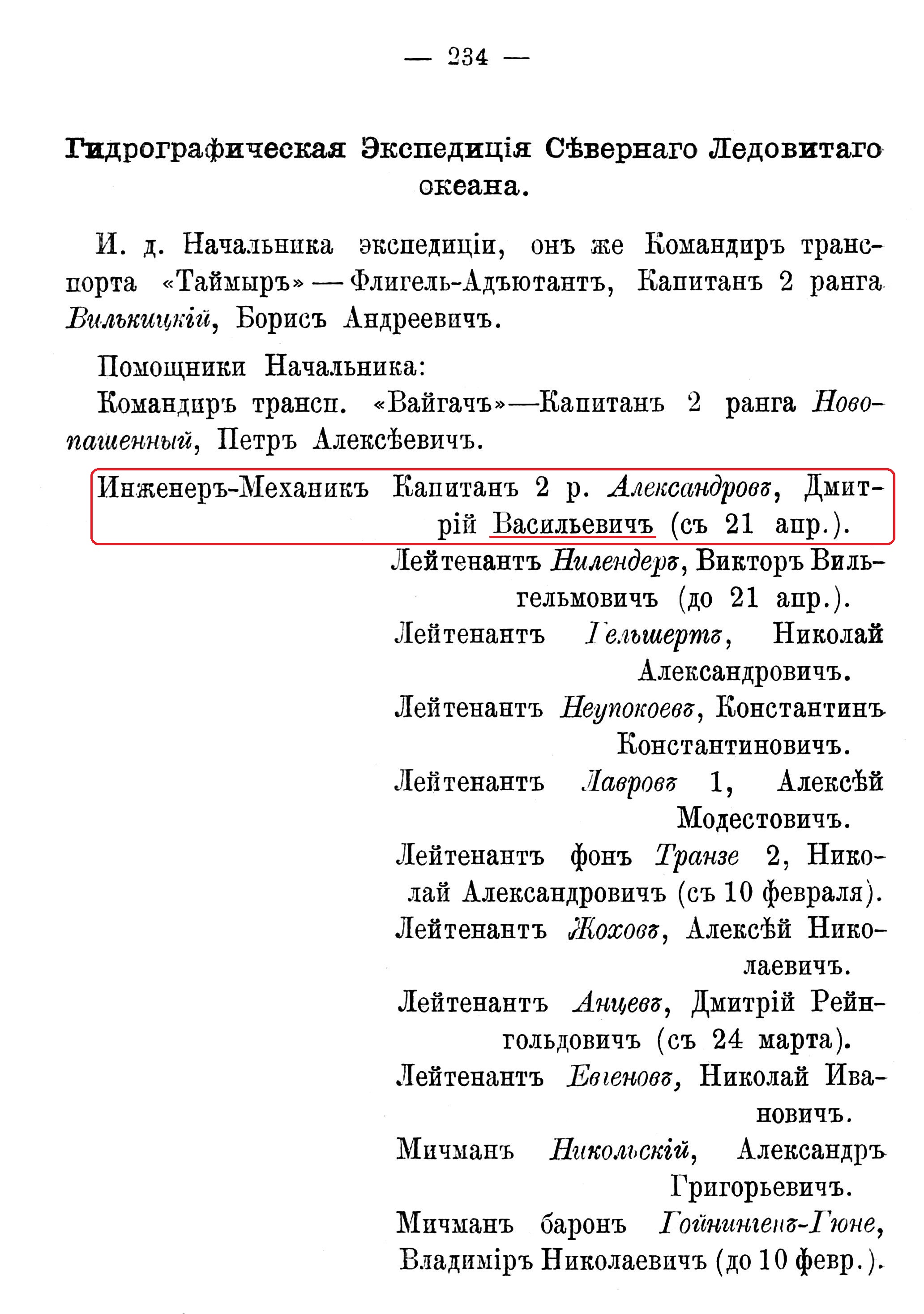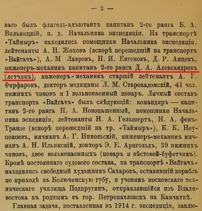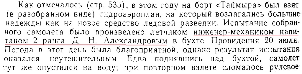 "На этом ледокольном пароходе находились..., летчик инженер-механик капитан 2-го ранга Д.Н. Александров, инженер-механик старший лейтенант А.Г. Фирфанов,..."