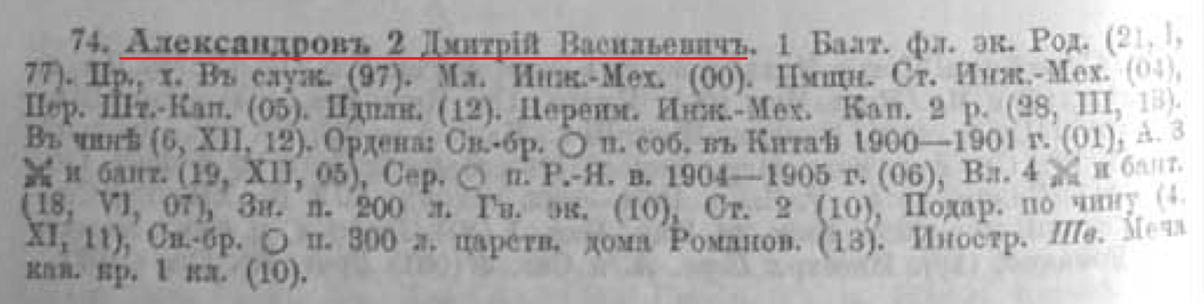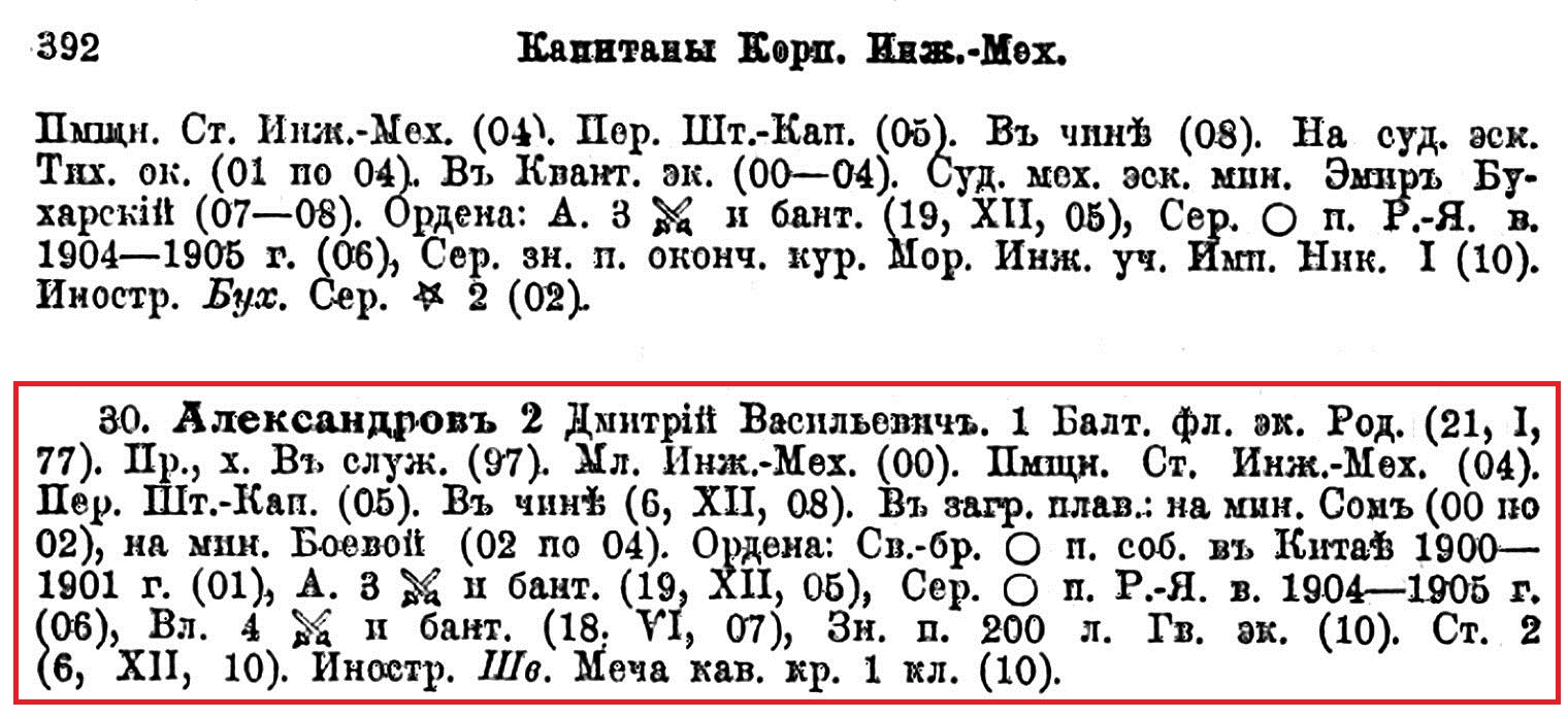 В Списках личного состава судов Флота, строевых и административных учреждений Морского Ведомства в 1911-1914 гг. иные Дмитрии Александровы не указаны: