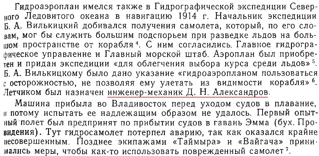 Гидроаэроплан имелся также в Гидрографической экспедиции Северного Ледовитого океана в навигацию 1914 г. Начальник экспедиции Б. А. Вилькицкий добивался получения самолета, который, по его словам, мог бы служить большим подспорьем при разведке льдов на большом пространстве от корабля {4}. С ним согласились. Главное гидрографическое управление и Главный морской штаб. Аэроплан был приобретен и придан экспедиции «для облегчения выбора курса среди льдов» {5}. Б. А. Вилькицкому было дано указание «гидроаэропланом пользоваться с осторожностью, не позволяя ему улетать из видимости корабля» {6}. Летчиком был назначен инженер-механик Д. Н. Александров.