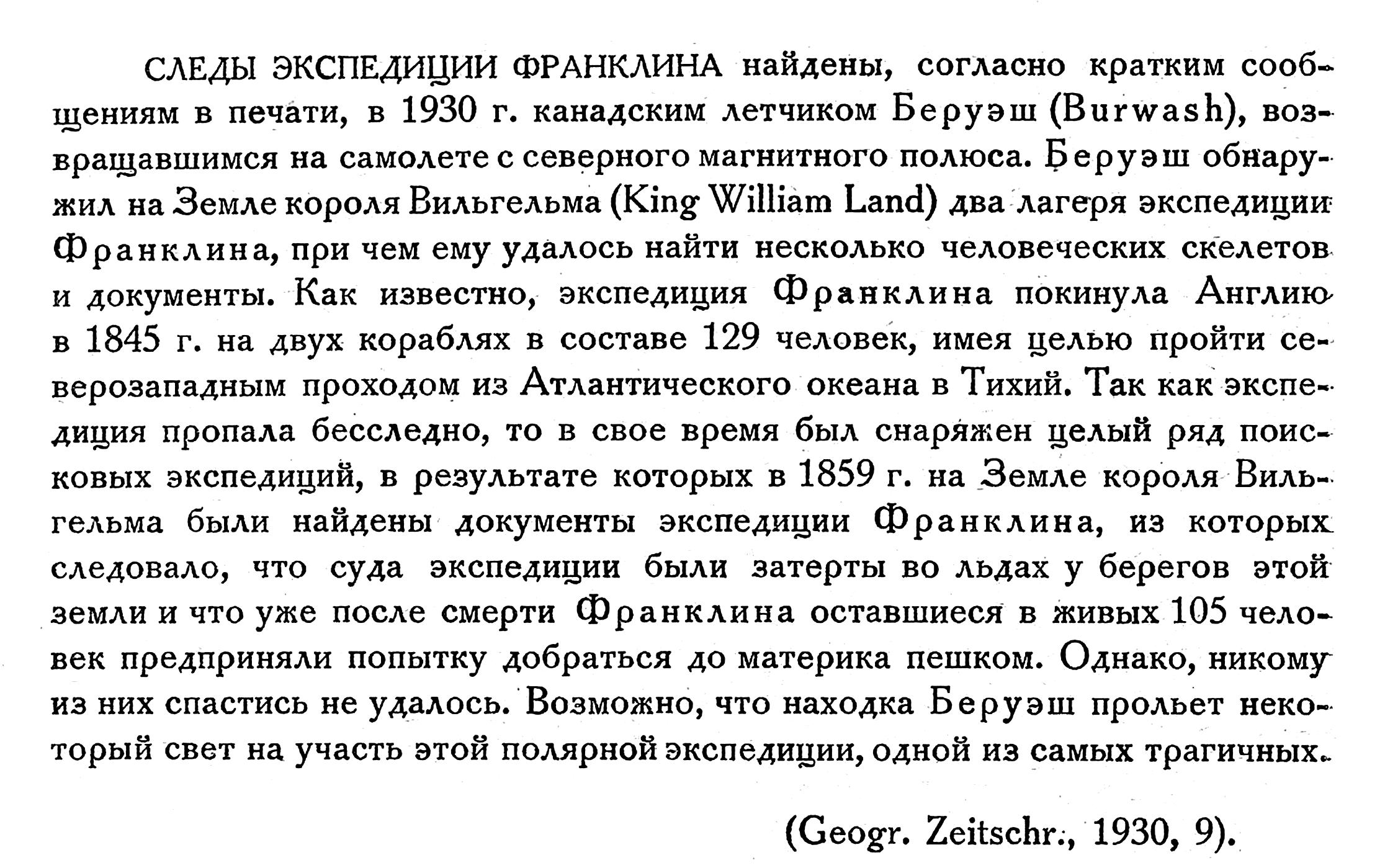 Д. Джемма, составленных со слов капитана Бэйна, участника поисковой экспедиции Халла (Hall) 1864—1869 гг. Некоторые факты, изложенные в упомянутом документе, давали указания на возможность находки останков экспедиции Франклина на земле Уильяма (о-в Вильгельма). На основании этих сведений Управлением Канадскими колониями были даны задания майору Бэруэш (L. Т. Burwash), отправлявшемуся в 1928 г., для исследовательских работ, в район Канадского архипелага, проверить сведения, изложенные в документе. Во время зимовки в 1928/29 г. Бэруэш получил от эскимосов некоторые дополнительные сведения об экспедиции Франклина, которые дают основание думать, что судьба экипажа судов „Эребус" и „Террор", возможно, несколько отличается от общепринятого варианта, в частности о месте оставления судов экипажем и гибели их. Для уточнения этих сведений и для дальнейшего разъяснения судьбы экспедиции Франклина, во время экспедиции, предпринятой в 1930 г. на аэроплане, Бэруэш посетил некоторые местности на о-ве Вильгельма, где с наибольшим вероятием возможно было сделать находки, относящиеся к походу экипажа судов „Эребус“ и „Террор" к югу. Бэруэшу удалось найти часть лагеря членов экспедиции Франклина на о-ве Вильгельма, на берегу пролива Виктории, и привезти некоторые реликвии. Упомянутые выше записки Бэйна в выдержках, отчет о сведениях, полученных Бэруэшем, и фотографии реликвий помещены в отчете об экспедициях Бэруэш а за 1925/26, 1928/29 и 1930 гг., под названием „Canadas Western Arctic", в Трудах Department of Interior, Ottawa, 1931.