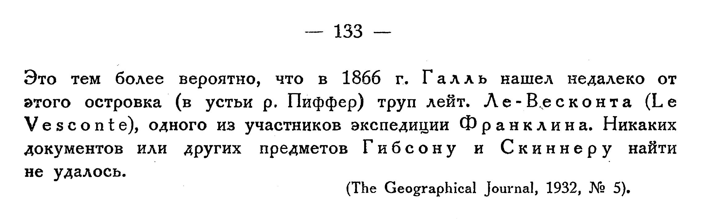 Это тем более вероятно, что в 1866 г. Галль нашел недалеко от этого островка (в устьи р. Пиффер) труп лейт. Ле-Весконта (Le Vеsсоntе), одного из участников экспедиции Франклина. Никаких документов или других предметов Гибсону и Скиннеру найти не удалось.