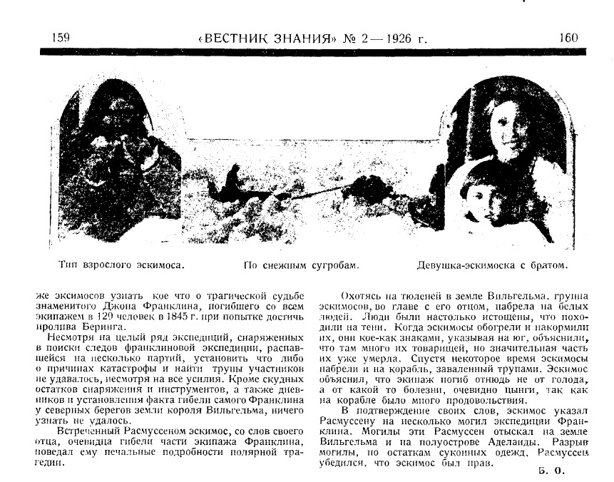 Вернувшемуся осенью 1925 г. из экспедиции в северные полярные страны известному полярному путешественнику Кнуду Расмуссену удалось от тех же эксимосов узнать кое что о трагической судьбе знаменитого Джона Франклина, погибшего со всем экипажем в 129 человек в 1845 г. при попытке достичь пролива Беринга.