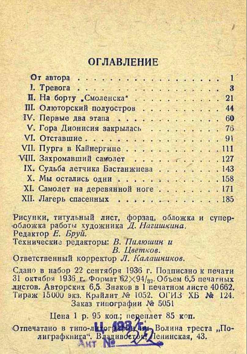 Кончив работу, гостеприимные чукчи пригласили нас в самую лучшую ярангу, но мы не могли усидеть в ней ни одной минуты, нас выгнал оттуда нестерпимый запах гниющих шкур и моржового мяса. Мы собрались было ночевать на снегу, но на счастье оказалась одна пустующая полусгоревшая яранга. Ее покрыли моржовыми шкурами, и мы улеглись, усталые, оторванные от всего мира. Это были как раз те дни, когда в газетах писали, что звено Каманина пропало без вести.