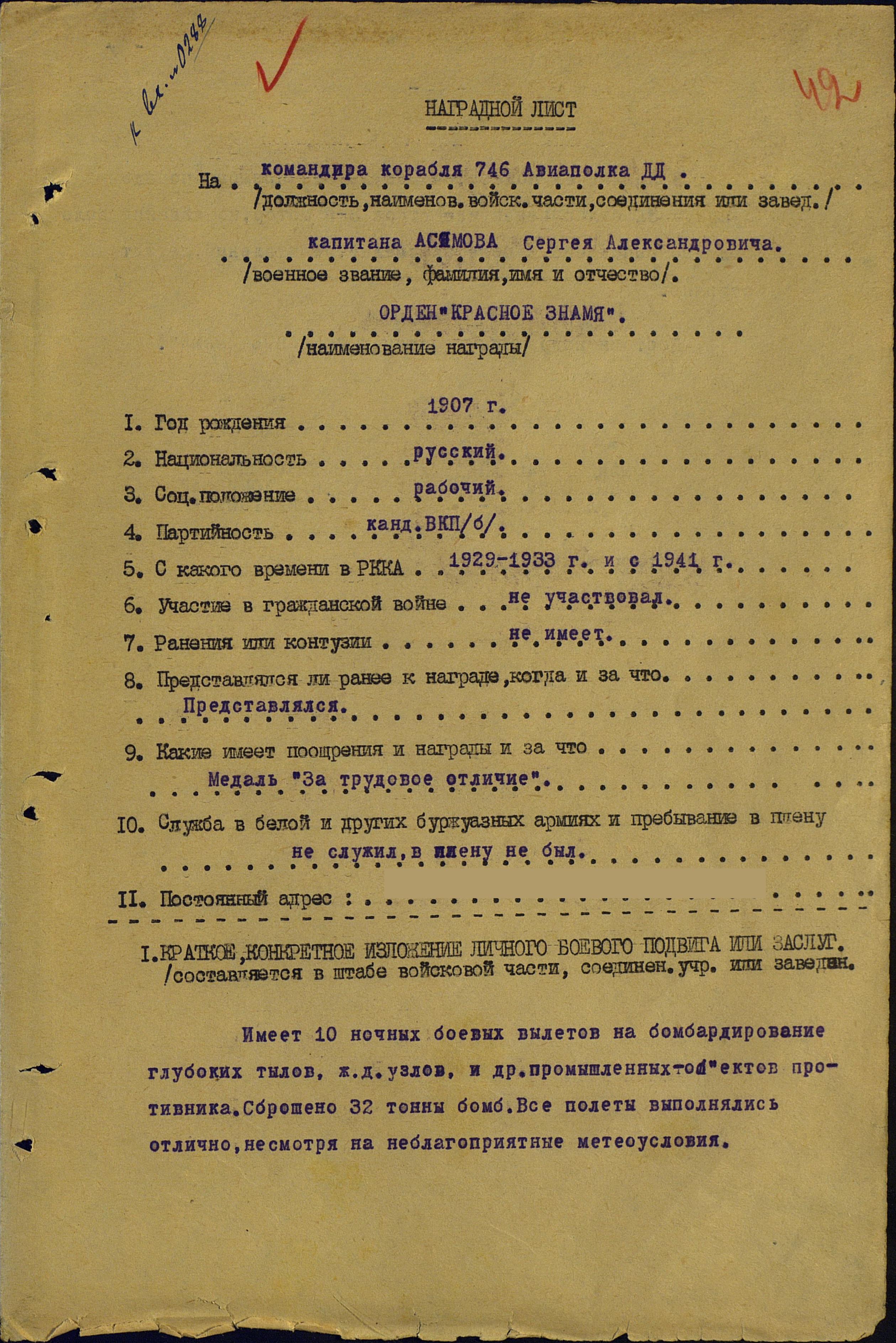 Вот извлечение из представления С.А. Асямова к званию Героя Советского Союза. Указ о присвоении ему звания Героя вышел в июне 1942 года (уже после гибели лётчика):