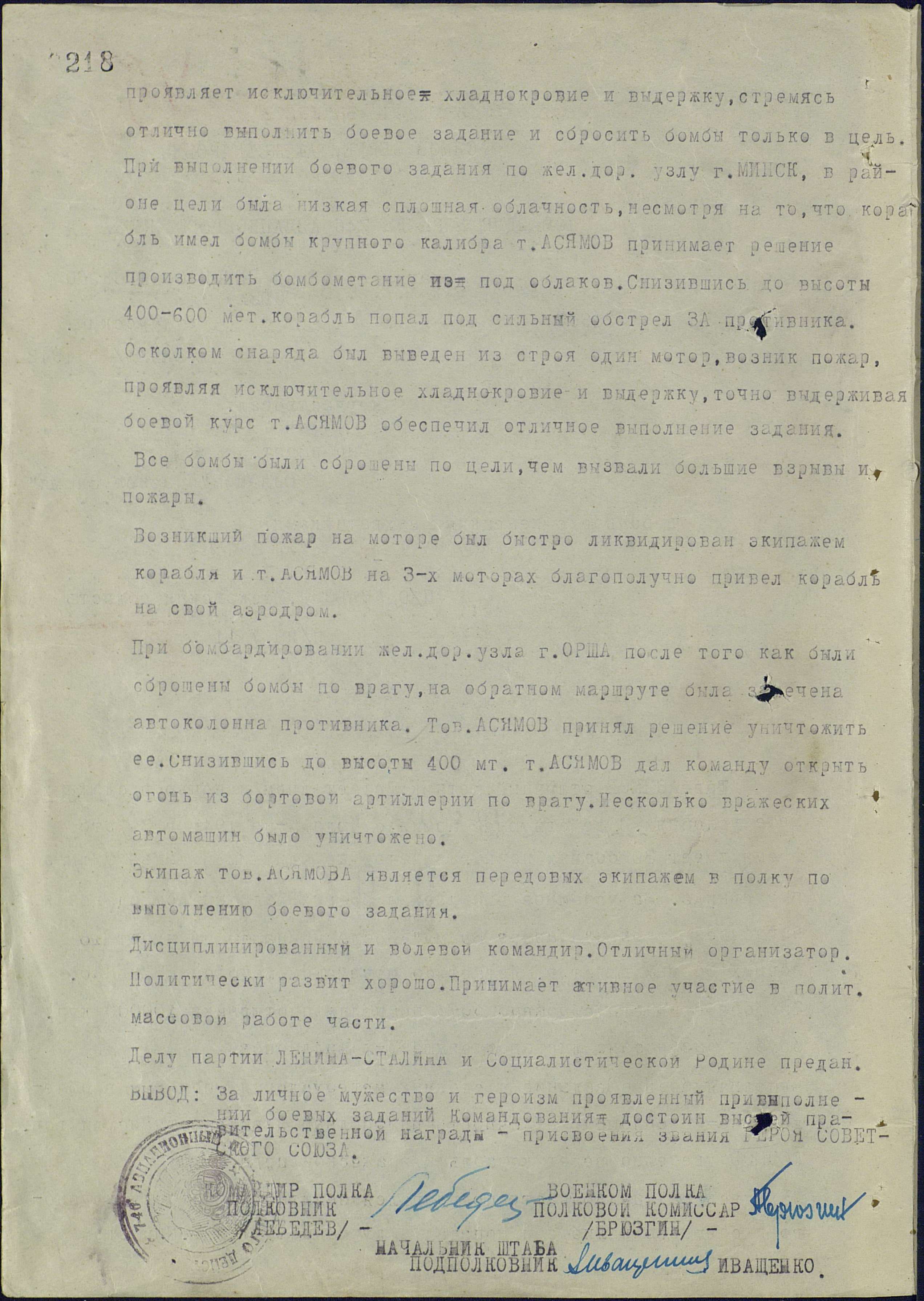 «…При бомбёжке железнодорожного узла г. Минска в районе цели была низкая облачность. Несмотря на то, что корабль имел бомбы крупного калибра, Асямов принимает решение производить бомбометание из-под облаков. Снизившись до высоты 400 – 600 метров, самолёт попал под сильный обстрел зенитной артиллерии противника. Осколком снаряда был выведен из строя один мотор, возник пожар. Проявляя исключительное хладнокровие, точно выдержав боевой курс, Асямов обеспечил отличное выполнение задания. Все бомбы были сброшены прямо в цель и вызвали большие взрывы и пожары.