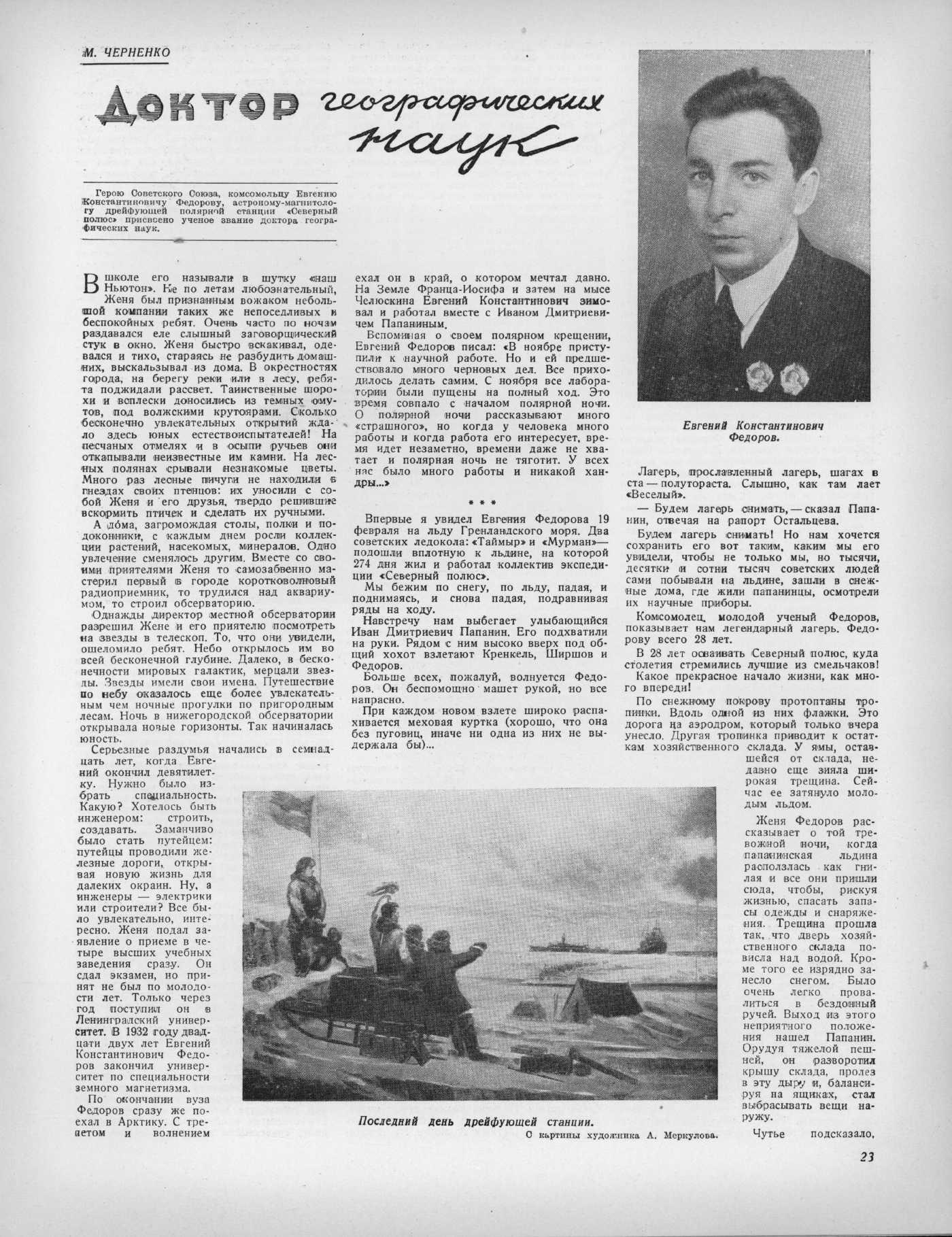 Герою Советского Союза, комсомольцу Евгению Константиновичу Федорову, астроному-магнитологу дрейфующей полярной станции «Северный полюс» присвоено ученое звание доктора географических наук.