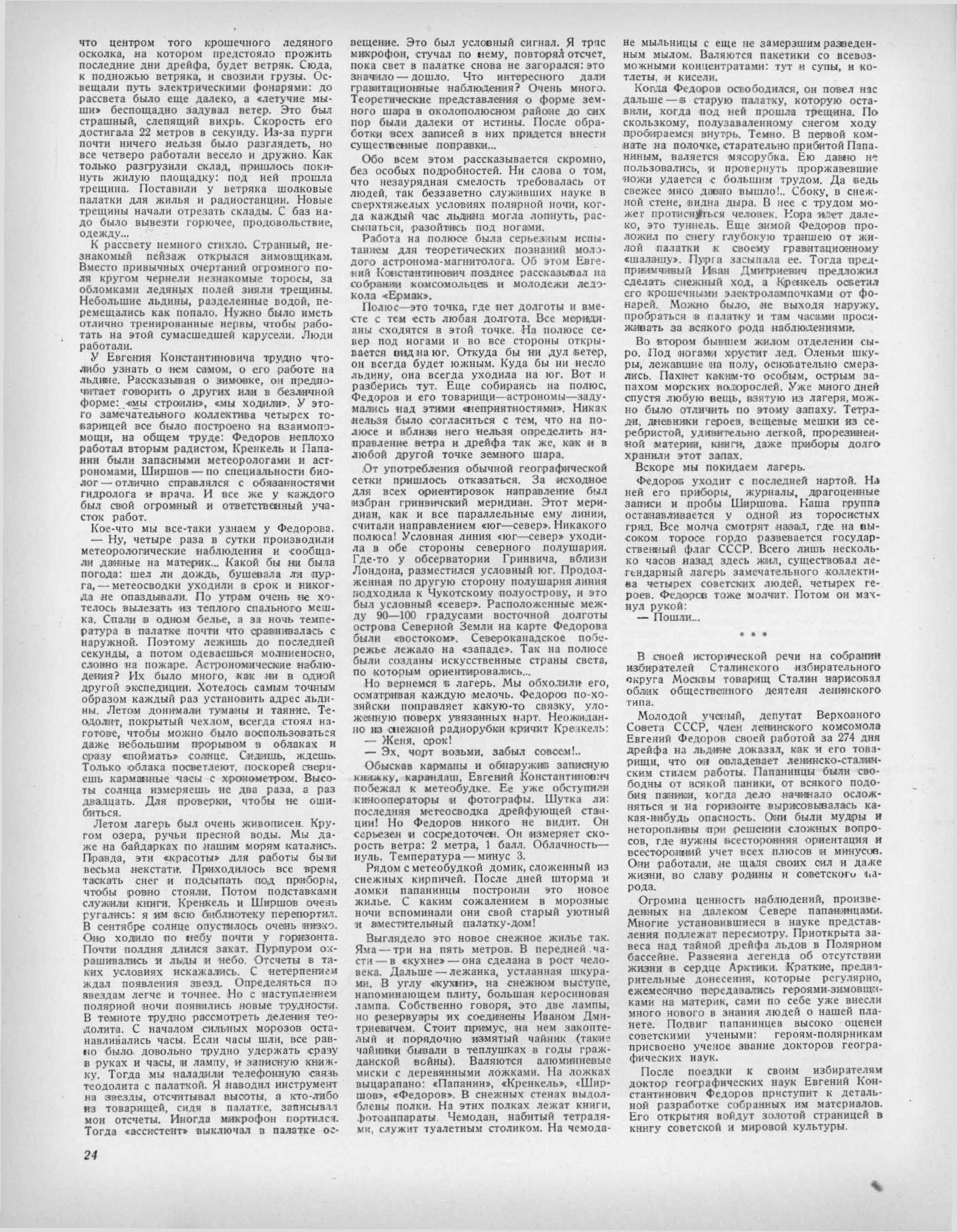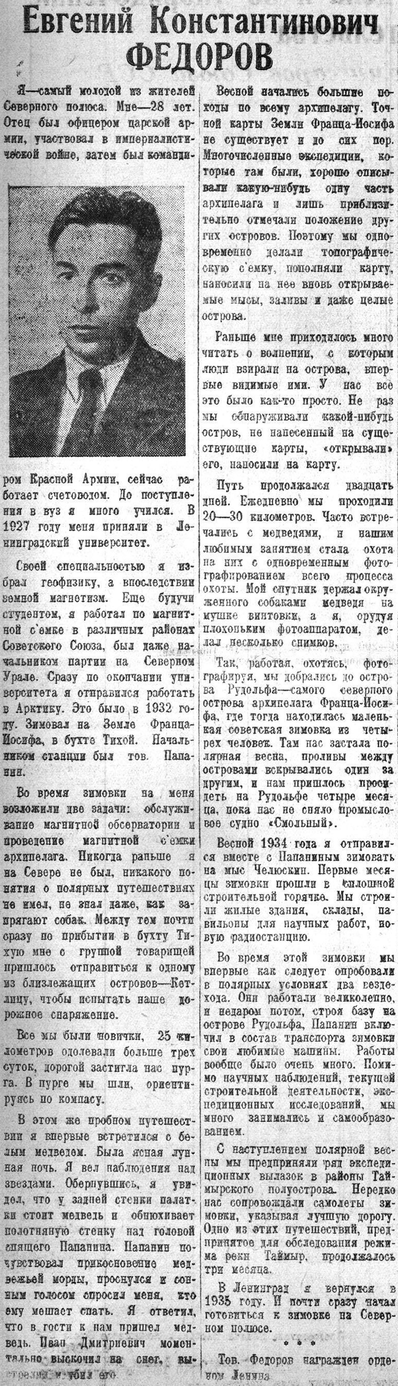 Молодой ученый, депутат Верховного Совета СССР, член ленинского комсомола Евгений Федоров своей работой за 274 дня дрейфа на льдине доказал, как и его товарищи, что он овладевает ленинско-сталинским стилем работы. Папанинцы были свободны от всякой паники, от всякого подобия паники, когда дело начинало осложняться и на горизонте вырисовывалась какая-нибудь опасность. Они были мудры и неторопливы при решении сложных вопросов, где нужны всесторонняя ориентация и всесторонний учет всех плюсов и минусов. Оки работали, не щадя своих сил и даже жизни, во славу родины и советского народа.