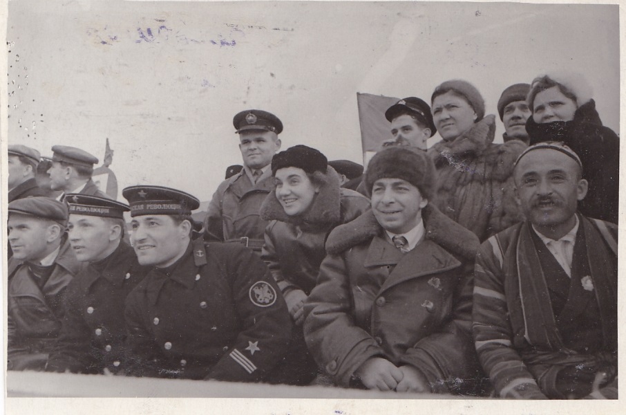 Навстречу нам выбегает улыбающийся Иван Дмитриевич Папанин. Его подхватили на руки. Рядом с ним высоко вверх под общий хохот взлетают Кренкель, Ширшов и Федоров.