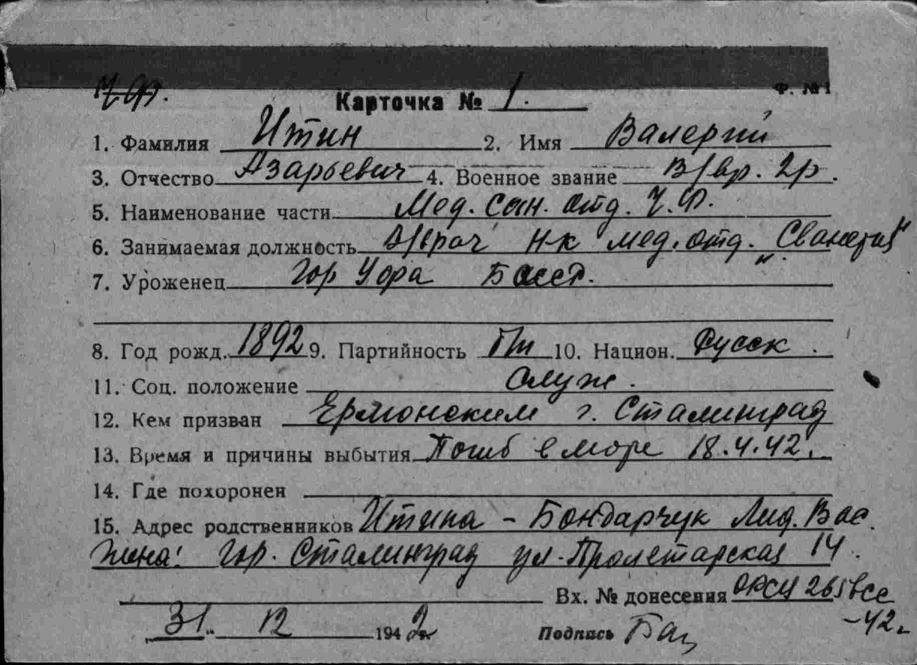 Валерий Азарьевич Итин был хирургом и погиб на судне «Сванетия», которое перевозило раненых и было потоплено немцами на пути из Севастополя в Сочи 17.4.1942 года. Валерий Азарьевич отдал свой спасательный пояс молоденькой медицинской сестре, а сам погиб с ранеными. Оба его сына (Игорь и Святослав) также погибли во время Отечественной войны. Игорь был переводчиком с немецкого и пропал без вести. Святослав вернулся с фронта в Сталинград, где они жили до войны, женился, родилась дочка. Погиб от случайной пули пьяного матроса.