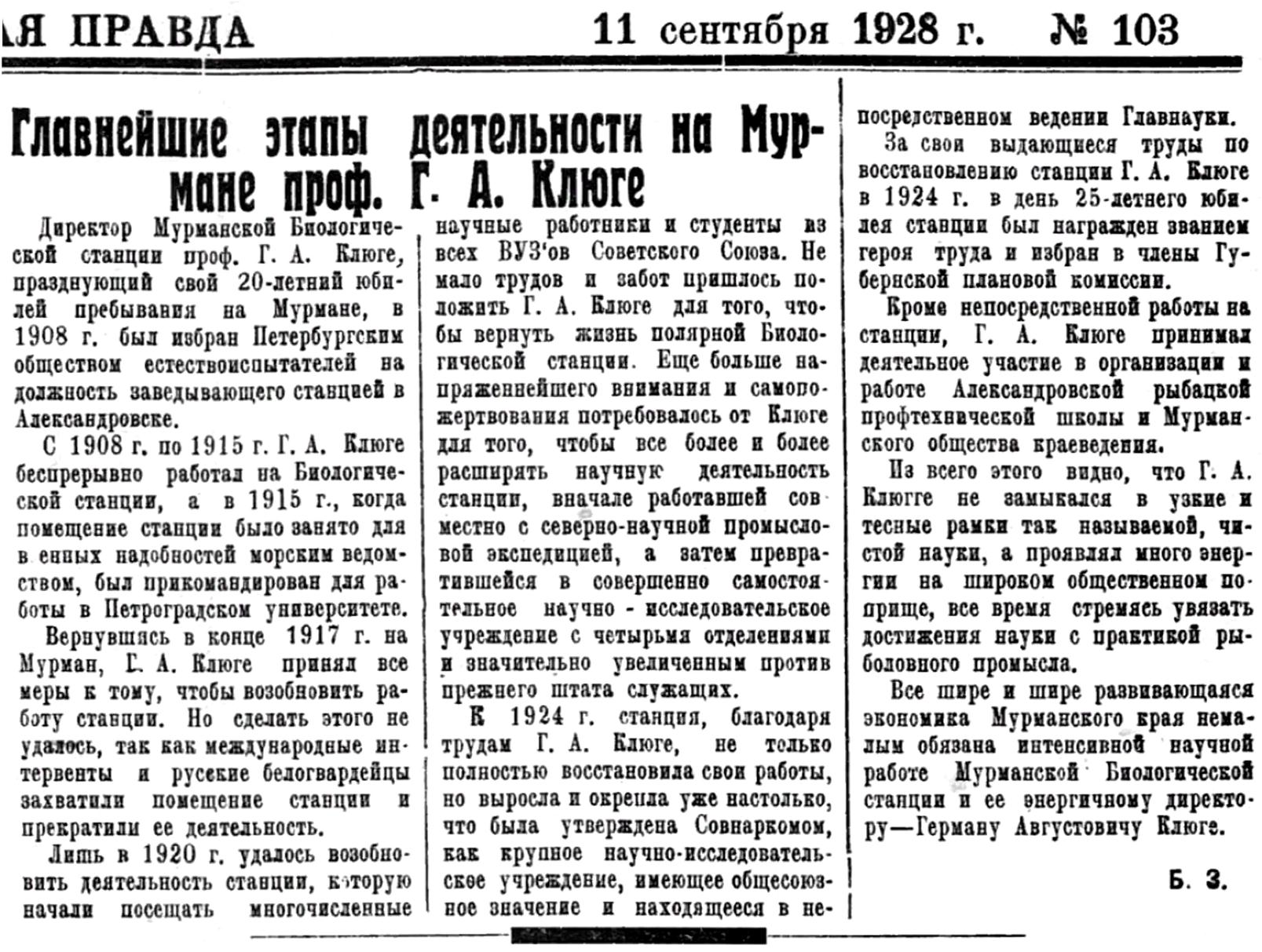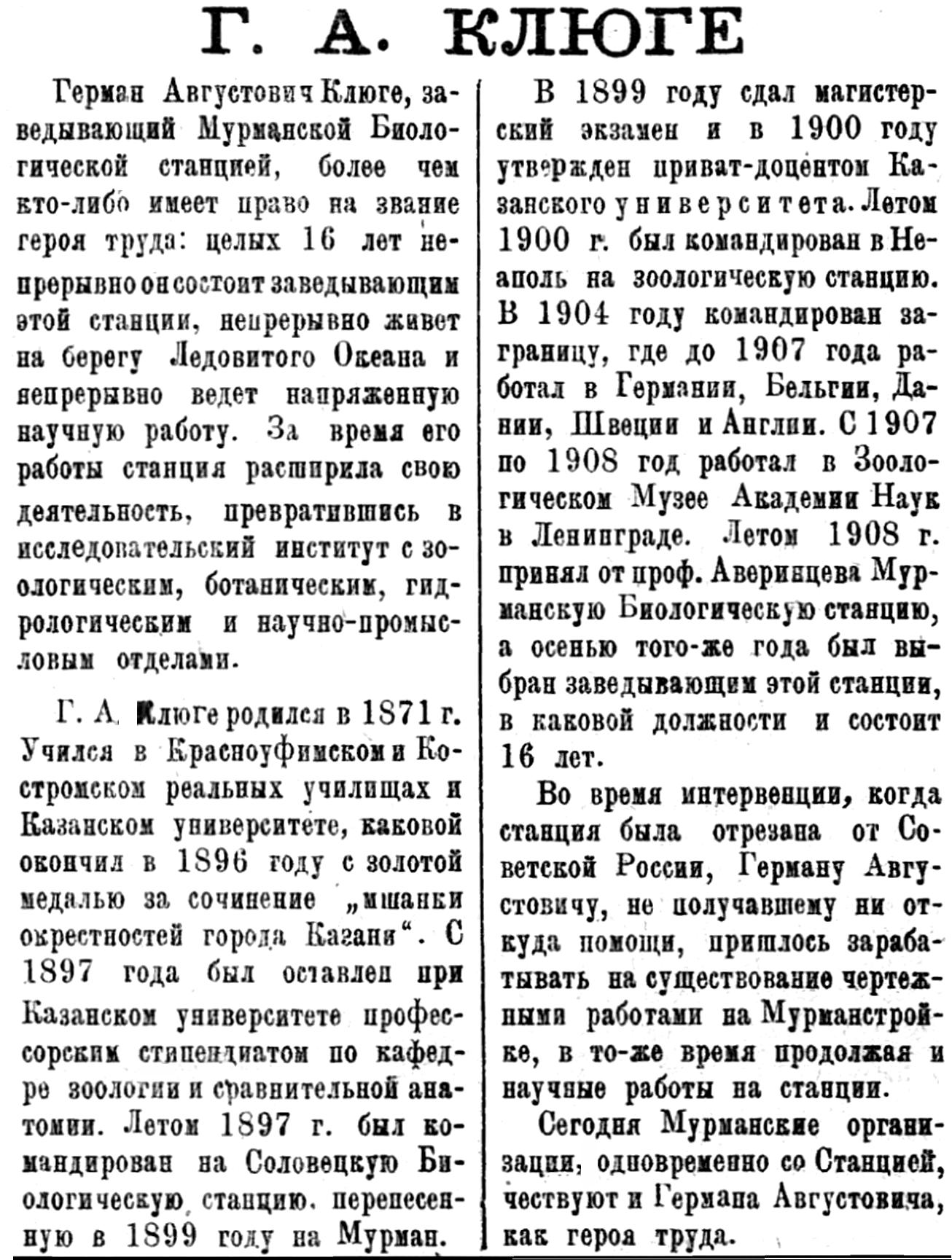 Герман Августович Клюге, заведывающий Мурманской Биологической станцией, более чем кто-либо имеет право на звание героя труда: целых 16 лет непрерывно он состоит заведывающим этой станции, непрерывно живет на берегу Ледовитого Океана и непрерывно ведет напряженную научную работу. За время его работы станция расширила свою деятельность, превратившись в исследовательский институт с зоологическим, ботаническим, гидрологическим и научно-промысловым отделами.