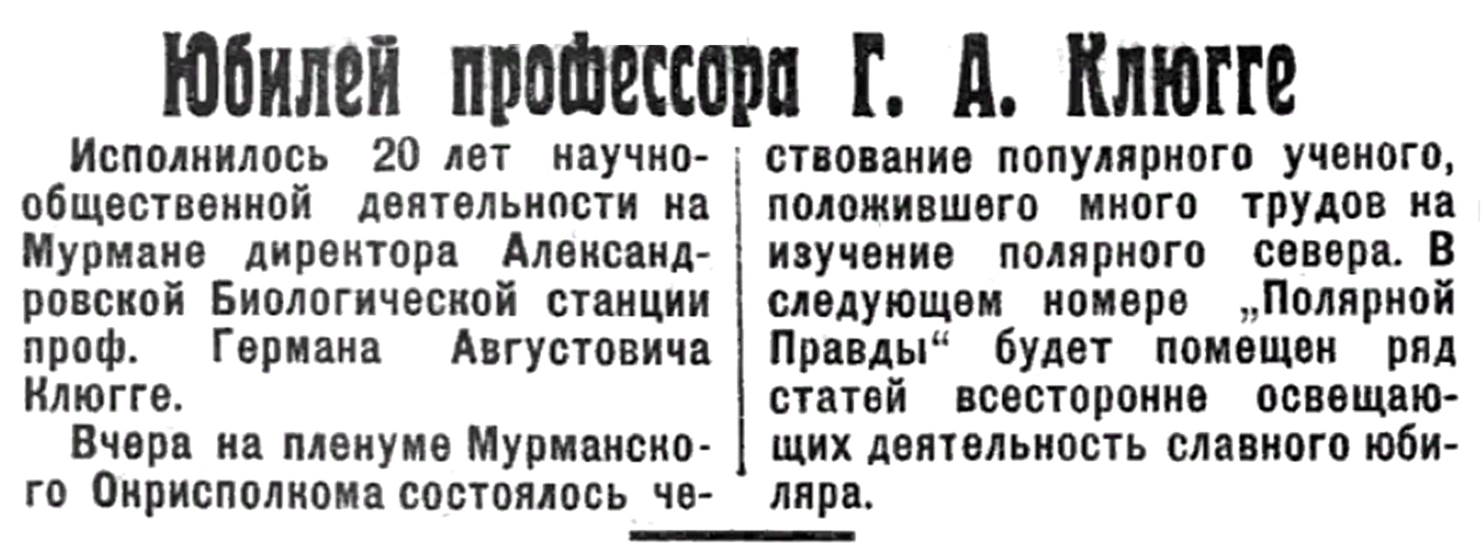 Полярная Правда, 1928, №102, 8 сентября КЛЮГЕ юбилей.jpg