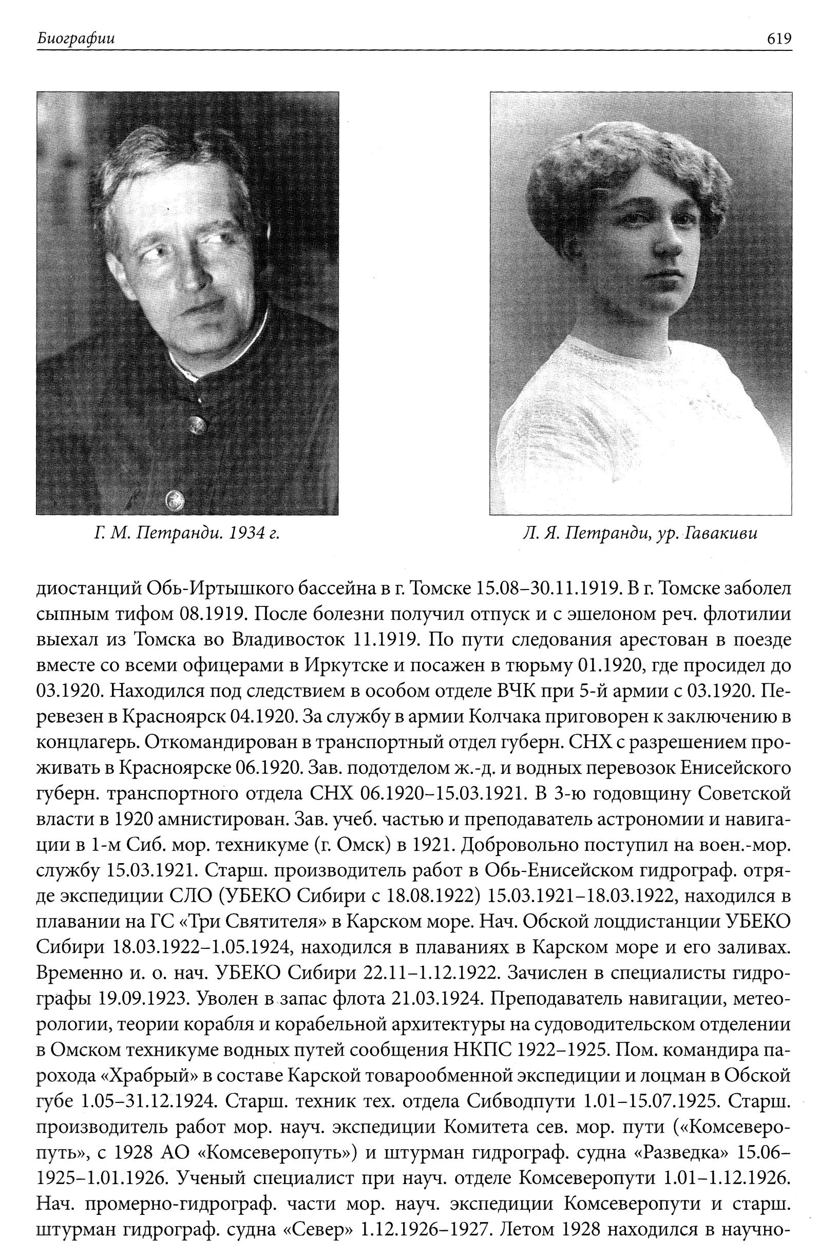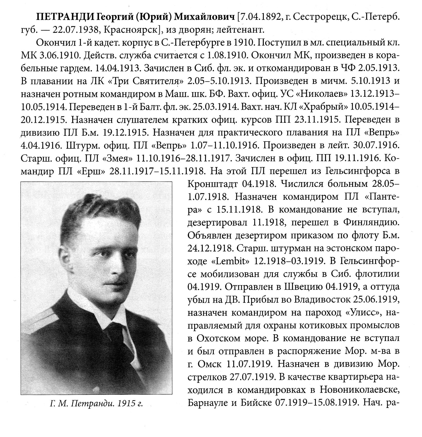ПЕТРАНДИ ГЕОРГИЙ (ЮРИЙ) МИХАЙЛОВИЧ (07.04.1892–?), лейтенант (30.07.1916). Из дворян, уроженец Сестрорецка. Окончил Морской корпус (1913), краткие курсы подводного плавания (1916). Служил вахтенным начальником учебного судна «Николаев», с мая 1914 г. — на канонерской лодке «Храбрый», с декабря 1915 г. — в дивизии подводных лодок. Служил на подводных лодках «Вепрь», «Змея», вр. и. д. командира подводной лодки «Ерш» (назначен 28.11.1917, вступил в должность в январе 1918 г.), участвовал в Ледовом походе. За участие в Первой мировой войне удостоен ордена Св. Станислава 3-й ст. с мечами и бантом (21.03.1916). В 1918 г. командовал подводной лодкой «Пантера», в ноябре бежал в Финляндию, с декабря 1918 по март 1919 г. был старшим штурманом эстонского парохода «Лембит». С другими офицерами 05.04.1919 выехал из Финляндии на Дальний Восток, служил в армии А. В. Колчака (с 08.1919 — начальник радиостанции Обь-Иртышского бассейна в Томске, заболел сыпным тифом, в январе 1920 г. арестован в Иркутске). В апреле 1920 г. перевезен в Красноярск, в июне 1920 г. как не участвовавший в боях направлен для службы в транспортном отделе губернского Совета народного хозяйства, участвовал в Карских экспедициях, в конце года амнистирован. С 15.03.1921 начал службу в Обь-Енисейском гидрографическом отряде, в мае 1924 г. уволен со службы. Плавал на сибирских реках (Сибводпуть) до 1937 г. Зам. начальника гидрографического управления Севморпути, начальник Красноярской экспедиции гидрографического управления. Арестован 25.10.1937 в Енисейске.