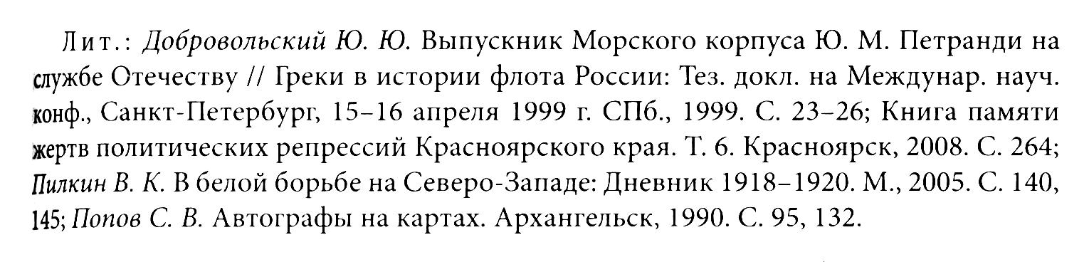 Лит.: Добровольский Ю. Ю. Выпускник Морского корпуса Ю. М. Петранди на службе Отечеству // Греки в истории флота России: Тез. докл. на Междунар. науч. конф., Санкт-Петербург, 15-16 апреля 1999 г. СПб., 1999. С. 23-26; Книга памяти жертв политических репрессий Красноярского края. Т. 6. Красноярск, 2008. С. 264; Пипкин В. К. В белой борьбе на Северо-Западе: Дневник 1918-1920. М., 2005. С. 140, 145; Попов С. В. Автографы на картах. Архангельск, 1990. С. 95, 132.