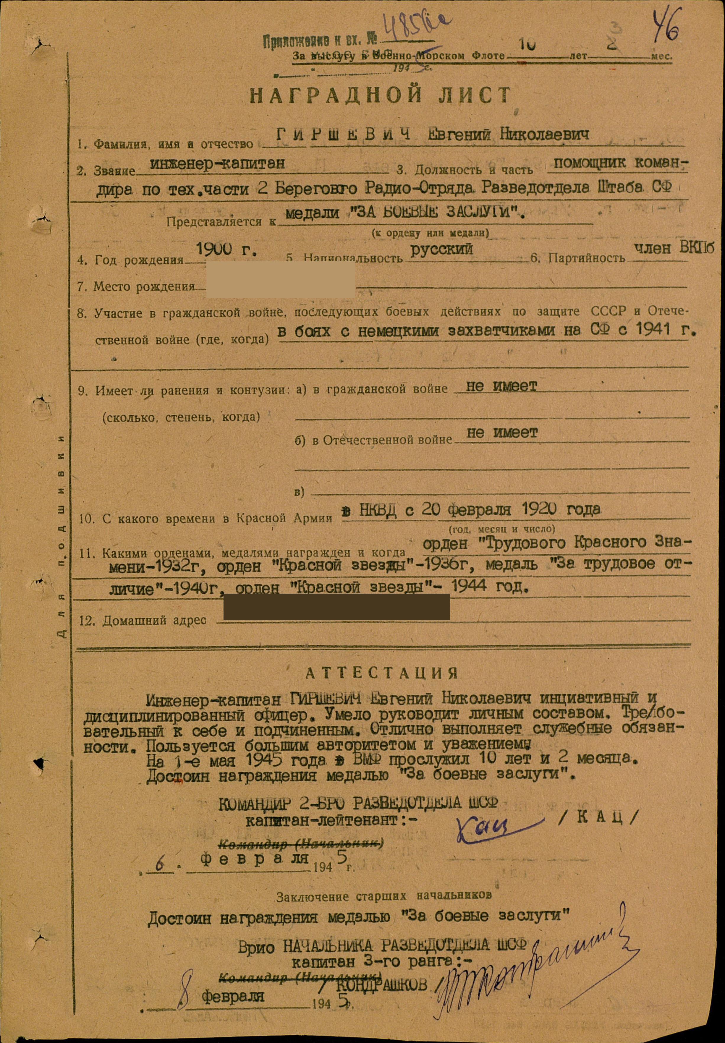 Когда рейс был успешно завершен, администрация, ячейка ВКП(б), судовой комитет и штаб ударничества и соцсоревнования наградили Евгения Николаевича Гиршевича грамотой за активность и энтузиазм, проявленные во время авральных работ. Этот документ радист передал позднее в Архангельский краеведческий музей {7}.