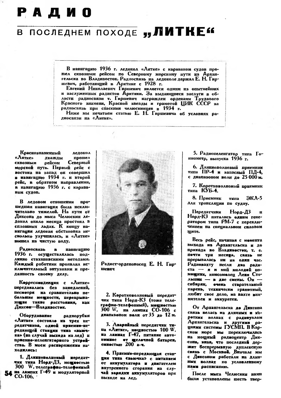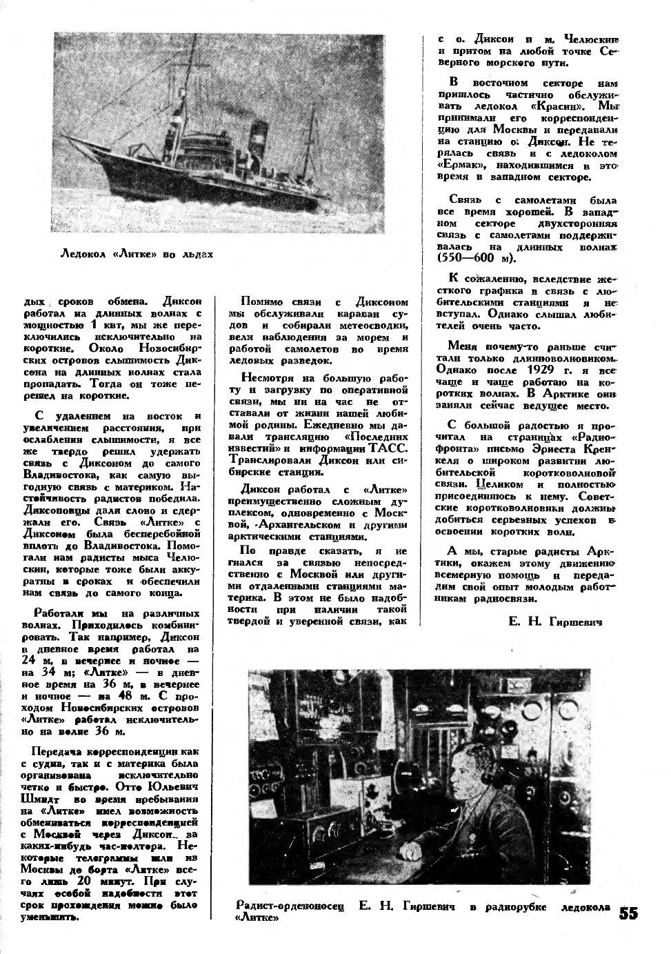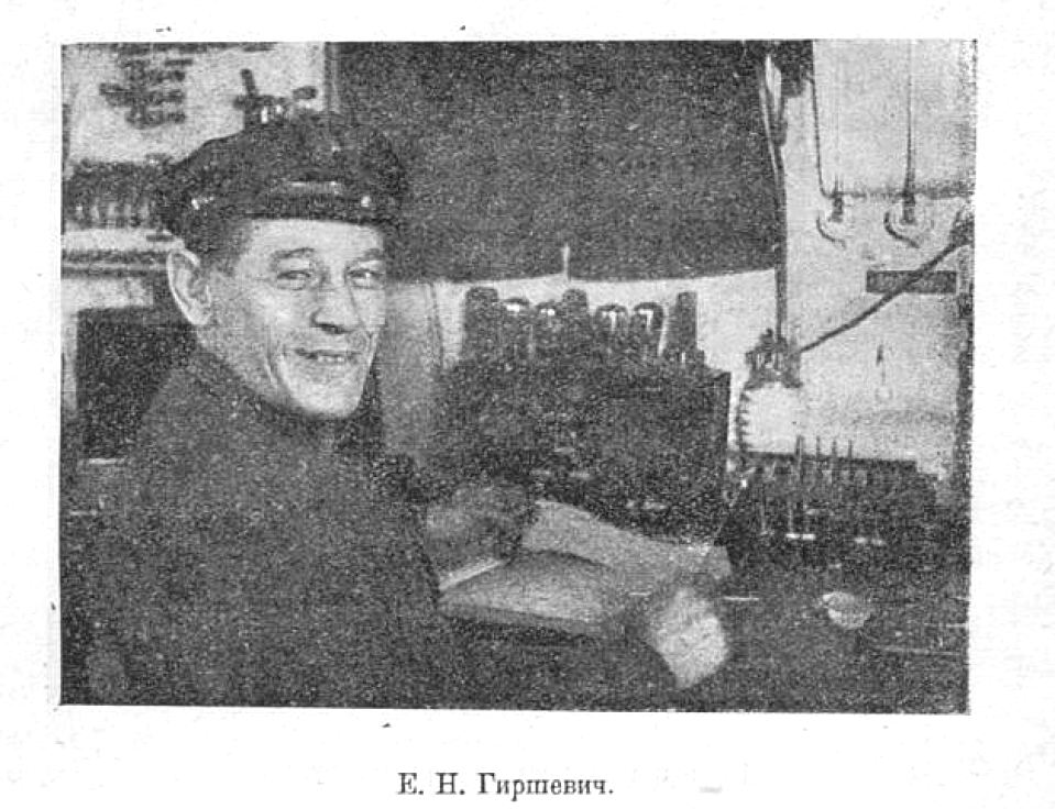 «Судовой «наркомпочтель» радист Гиршевич – любимец всего экипажа. Это он доставляет радость получения весточки с родины и поддерживает постоянную связь с берегом. Благодаря его станции, где бы мы ни находились – затёртые во льдах или в открытом бурном океане – всегда имеем постоянную возможность снестись с далекими семьями. Гиршевич – энтузиаст своего дела. Посмотрите, как зажигается его лицо, как радостно вспыхивают и блестят глаза, когда он показывает вам свою гордость – новую радиотелефонную установку. На круглых металлических часах черная стрелка медленно подбирается к цифре два. Сейчас начнется передача метеорологической сводки на материк. Каждый день регулярно в радиобудке проявляется профессор Визе и приносит маленький лист бумаги, исчерченный столбцами непонятных многозначных цифр. И каждый день Гиршевич или его помощник Ворожцов посылают в туманную даль непонятные точки, тире, которые там, в Москве и Ленинграде, превратятся в стройные газетные фразы бюро предсказания погоды».
