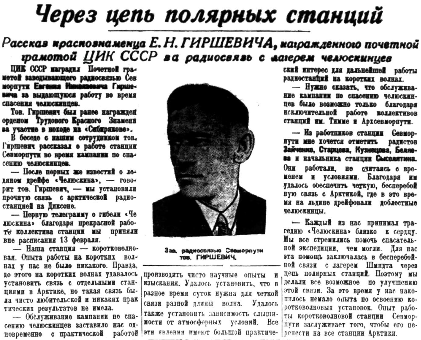 «Мы познакомились с Гиршевичем в 1935 году на «Садко» во время первой высокоширотной экспедиции. Он был тогда старшим радистом. Он уже тогда таскал за плечами изрядный груз полярной работы. Он уже тогда был орденоносцем и пользовался славой одного из лучших радистов Арктики. Гиршевичу 39 лет, и половину своей жизни он отдал Арктике. Он первый вместе с Кренкелем на «Сибирякове» прошел Великий Северный морской путь. Он первый в этом, кончающемся году прошёл с Папаниным Северный морской путь дважды в одну навигацию на «И. Сталине». Он пять раз прошел Великий Северный морской путь. Наша экспедиция – одиннадцатая, в которой он участвует. Он плавал из Мурманска во Владивосток и из Мурманска в Черное море. Он участвовал в поисках Амундсена. Он бывал на Земле Франца-Иосифа и на Северной Земле. И всегда радисты всего мира с радостью слушали мерную радиоречь, охотно, с удовольствием предлагали услуги, беседовали с ним, принимали его корреспонденции.