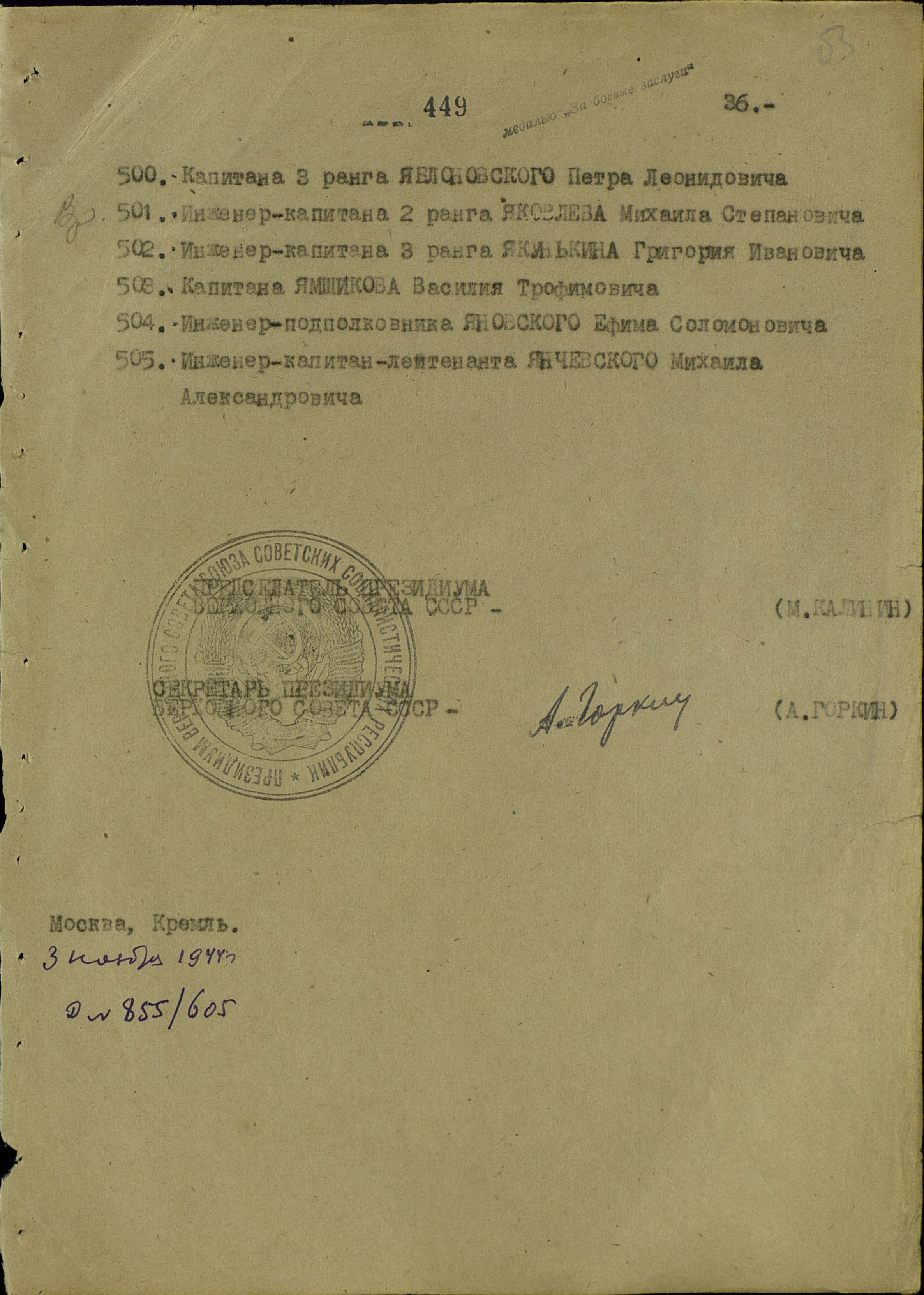 Наградной лист: фонд 3 опись 1 единица хранения 1141