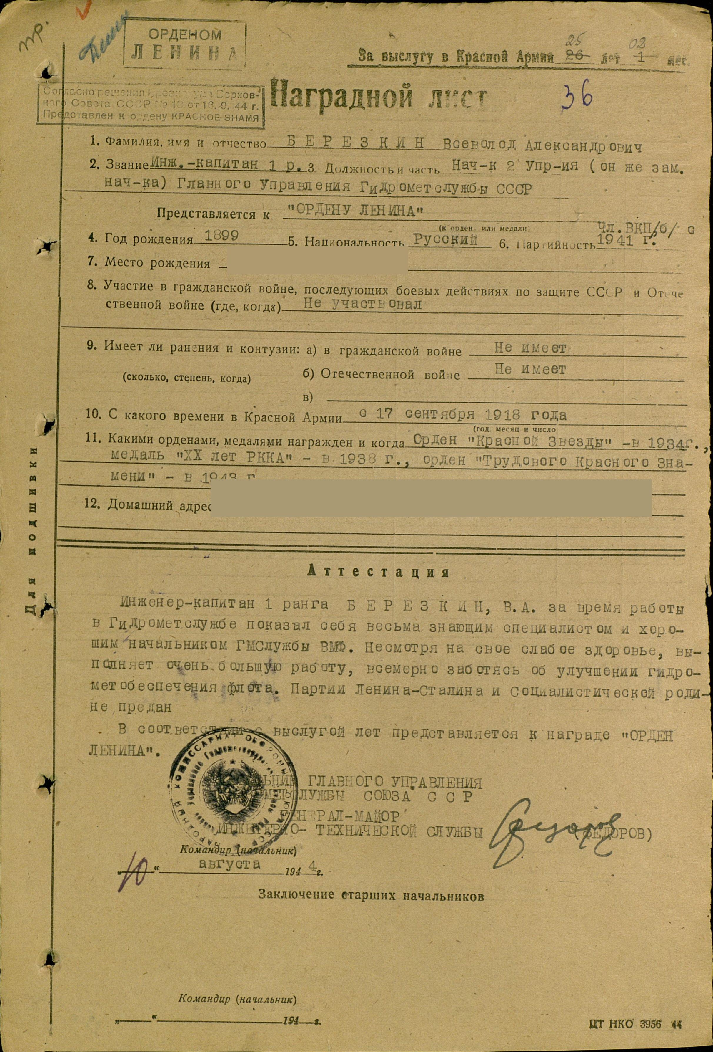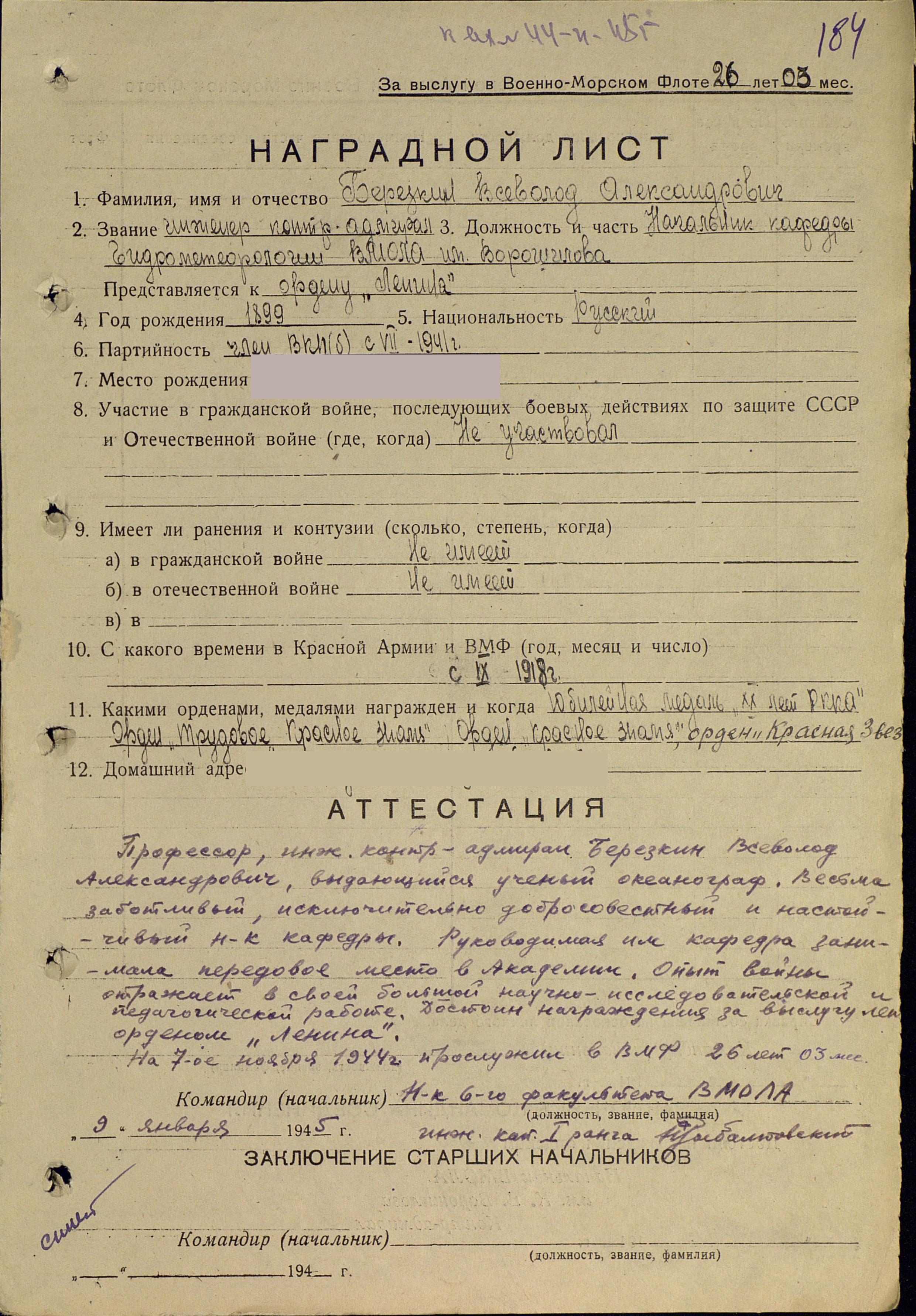 Березкин Всеволод Александрович (1899-1946). Океанолог, инженер, контр-адмирал, зав. кафедрой гидрометеорологии Военно-морской академии.