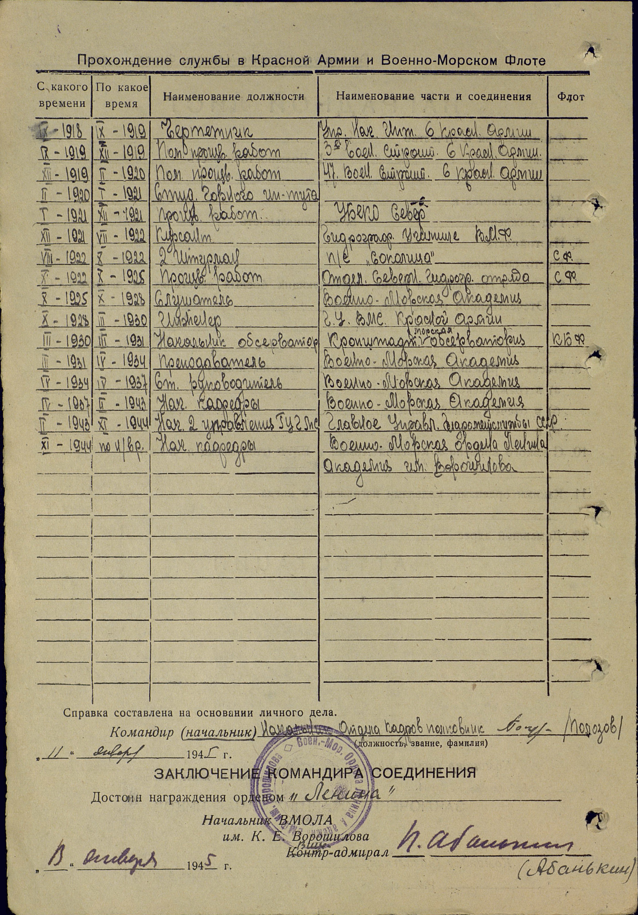 В годы Вел. Отеч. войны исполн. должн. зам. нач-ка Гл. упр. гидрометеорологич. сл. СССР, одновременно нач-к упр. Гидрометеосл. ВМФ (1-3.1943), зам. нач-ка Гл. упр. гидрометеорологам, сл. КА, нач-к Гидрометеорологич. сл. ВМФ, нач-к кафедры гидрометеорологии ВМА им. К. Е. Ворошилова (все должности с 3.1943 одновременно). В дек. 1943 освобожден от должности нач-ка кафедры. Нач-к Гл. упр. метео-рологич. сл. СССР (9-11.1944), нач-к кафедры гидрометеорологии ВМА им. К. Е. Ворошилова (9.1944-9.1945), ВМАКВ им. А. Н. Крылова (9.1945-2.1946).