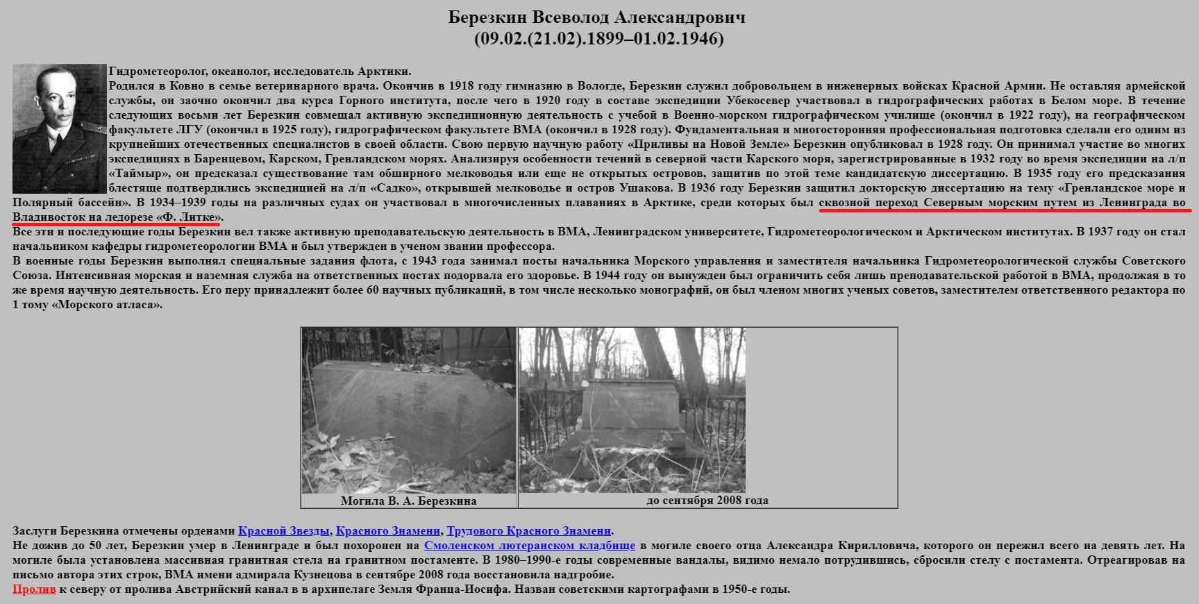 Березкин Всеволод Александрович [9(21).2.1899, г. Ковно, ныне Каунас, Литва — 1.2.1946, Ленинград], сов. ученый океанолог, исследователь Арктики. Русский; инженер-контр-адмирал (5.11.1944); доктор геогра-фич. наук и профессор (1937); в ВМФ с 1921; член компартии с 1941. Окончил один курс Горного ин-та в Петрограде (2.1920-1.1921), Воен-но-мор. гидрографич. уч-ще (12.1921-7.1922), гидрографич. факультет Военно-мор. акад. (10.1925-10.1928), географич. факультет ЛГУ (11.1921-7.1924), аспирантуру при нем (1931).