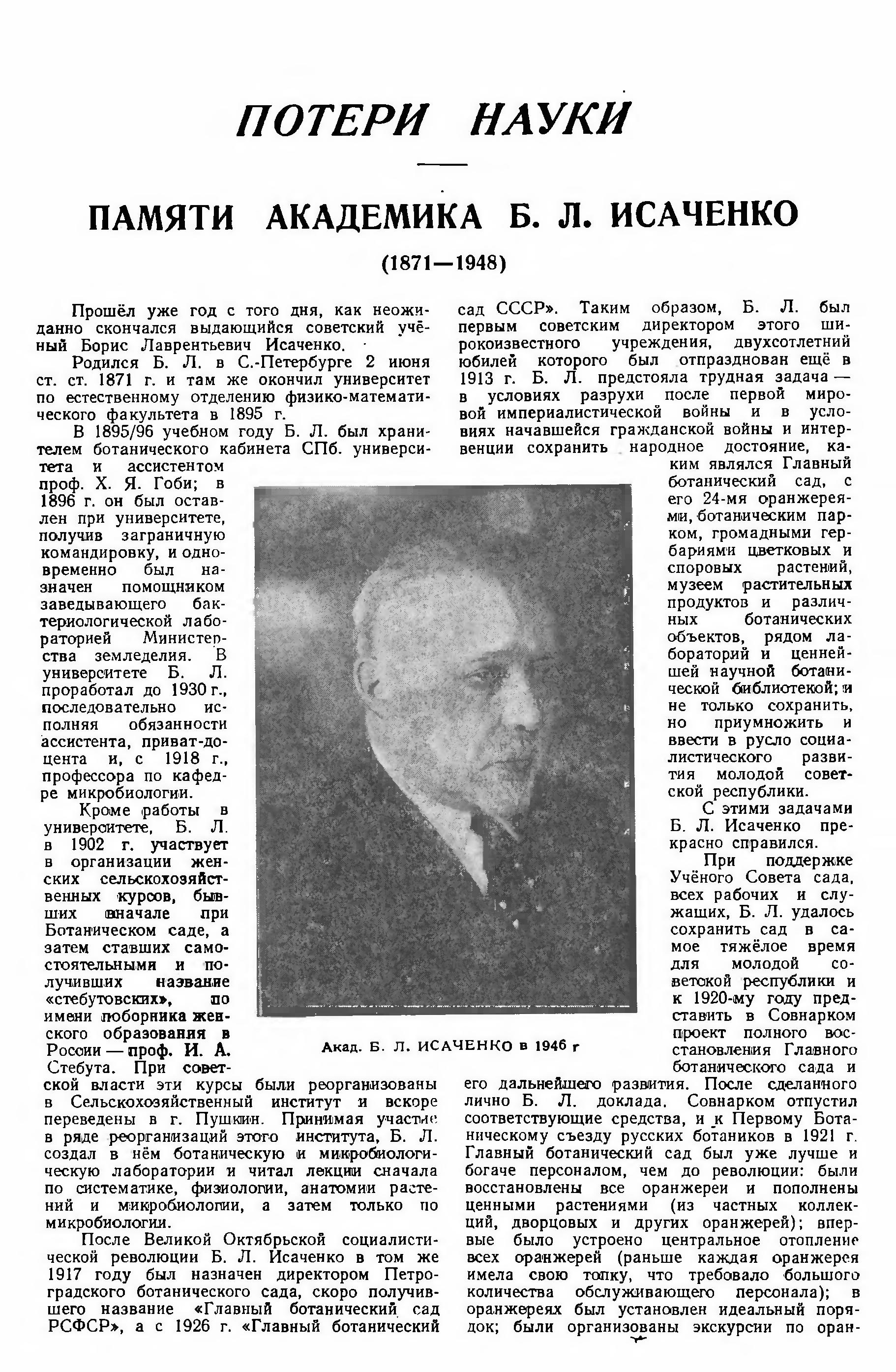 17 ноября после непродолжительной болезни скончался на 78-м году жизни крупнейший русский ученый, академик, действительный член Академии наук Украинской ССР, заслуженный деятель науки, директор Института микробиологии Академии наук СССР и председатель Всесоюзного гидробиологического общества Борис Лаврентьевич Исаченко.